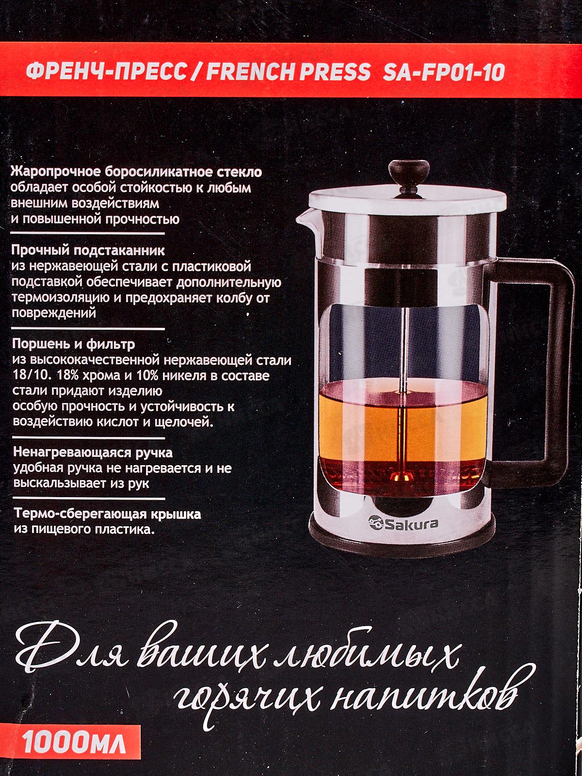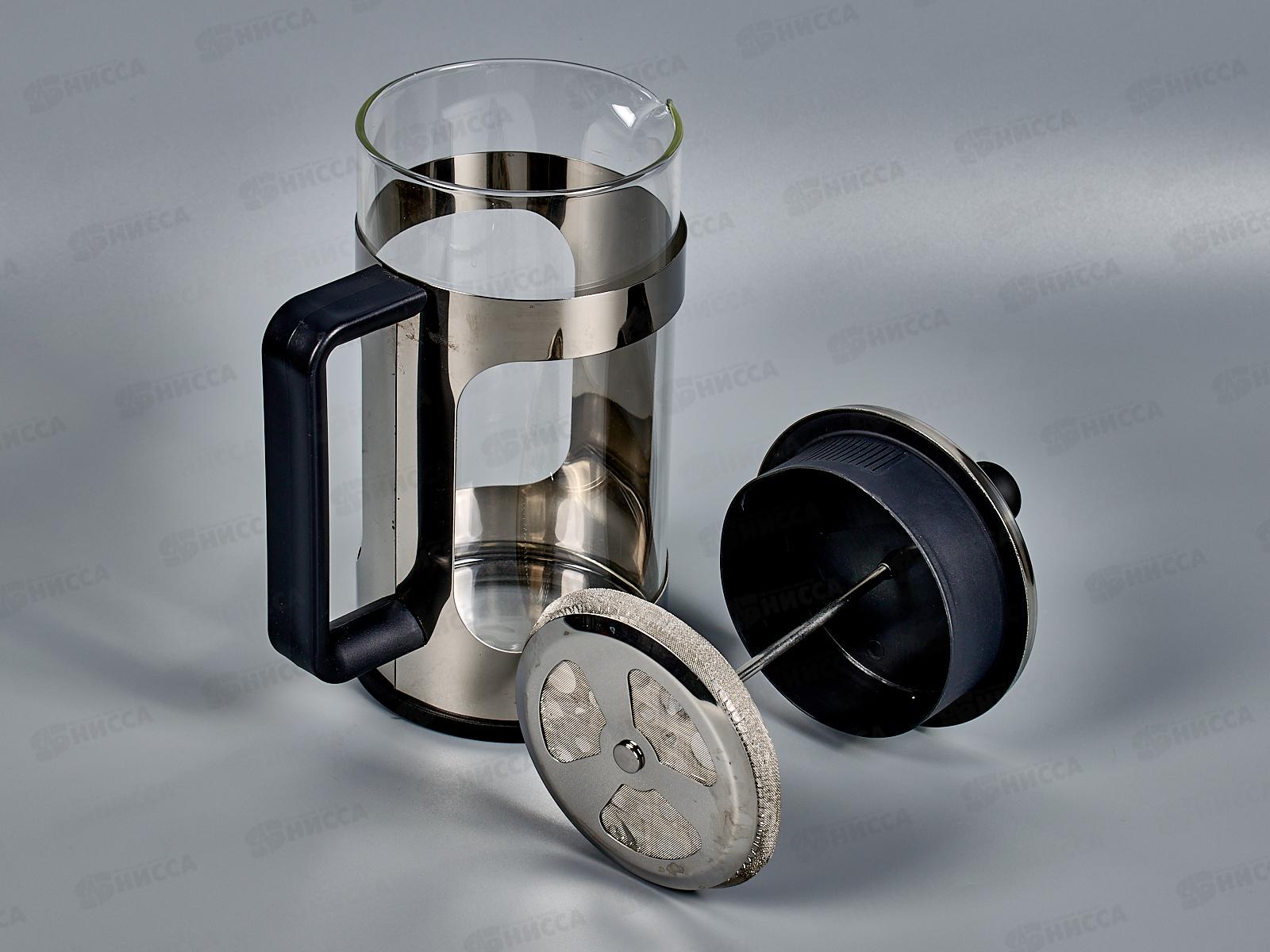 Объем 1000мл; материал боросиликатное стекло, нержавеющая сталь, пластик. Френч-пресс изготовлен из жаропрочного боросиликатного стекла, с фильтрующим поршнем из нержавеющей стали, пластиковая ручка и крышка хром. Подходит для заваривания кофе и чая. Пос