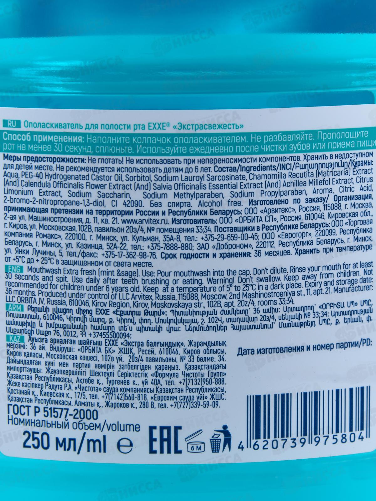 EXXE ополаскиватель для рта Экстра свежесть голубой 250мл *12 С0006466