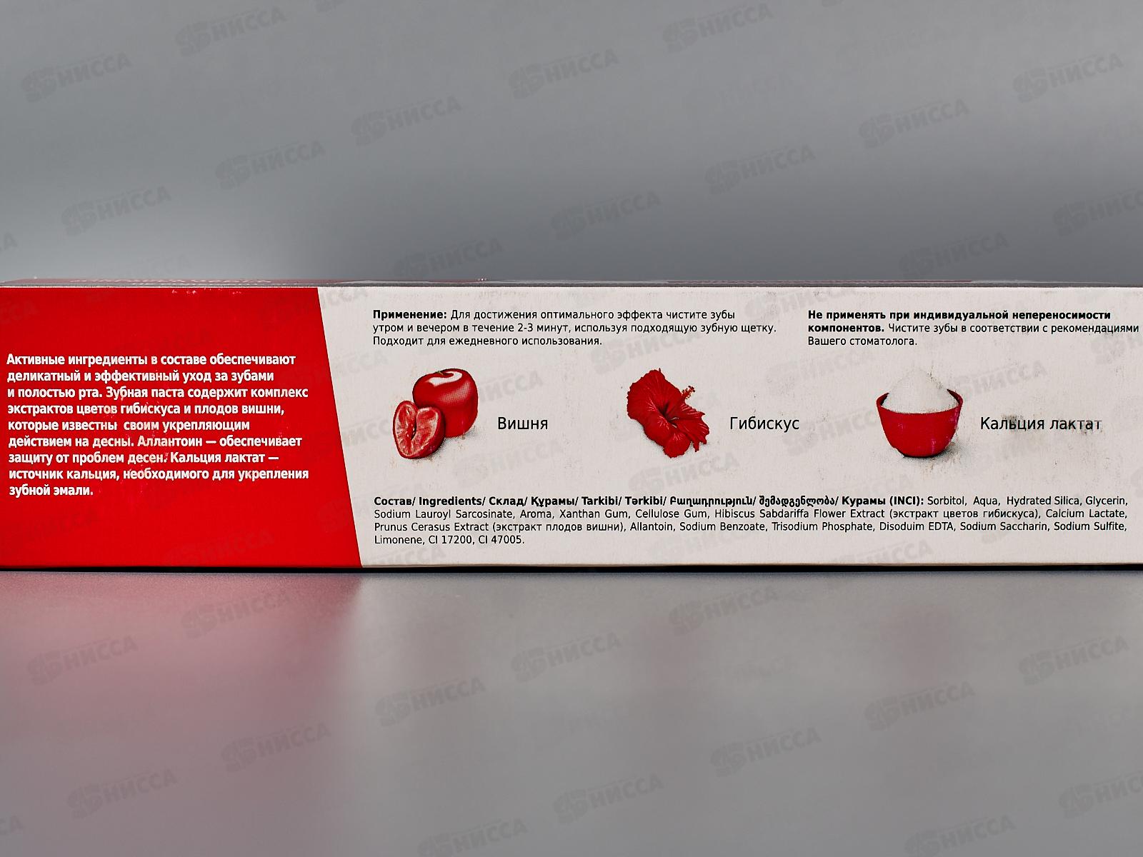 Активные ингредиенты в составе обеспечивают деликатный и эффективный ухода за зубами и полостью рта. Состав: Сорбит, Вода, Гидратированный диоксид кремния, Глицерин, Лауроилсаркозинат натрия, Ароматизатор, Ксантановая камедь, Целлюлозная камедь, экстракт цветков гибискуса сабдариффа (экстракт гибискуса), лактат кальция, Экстракт чернослива (экстракт плодов вишни), Аскорбилфосфат натрия, бензоат натрия, тринатрийфосфат, Динатрия ЭДТА, Сахарин натрия, Лимонен, CI 17200,CI 47005.