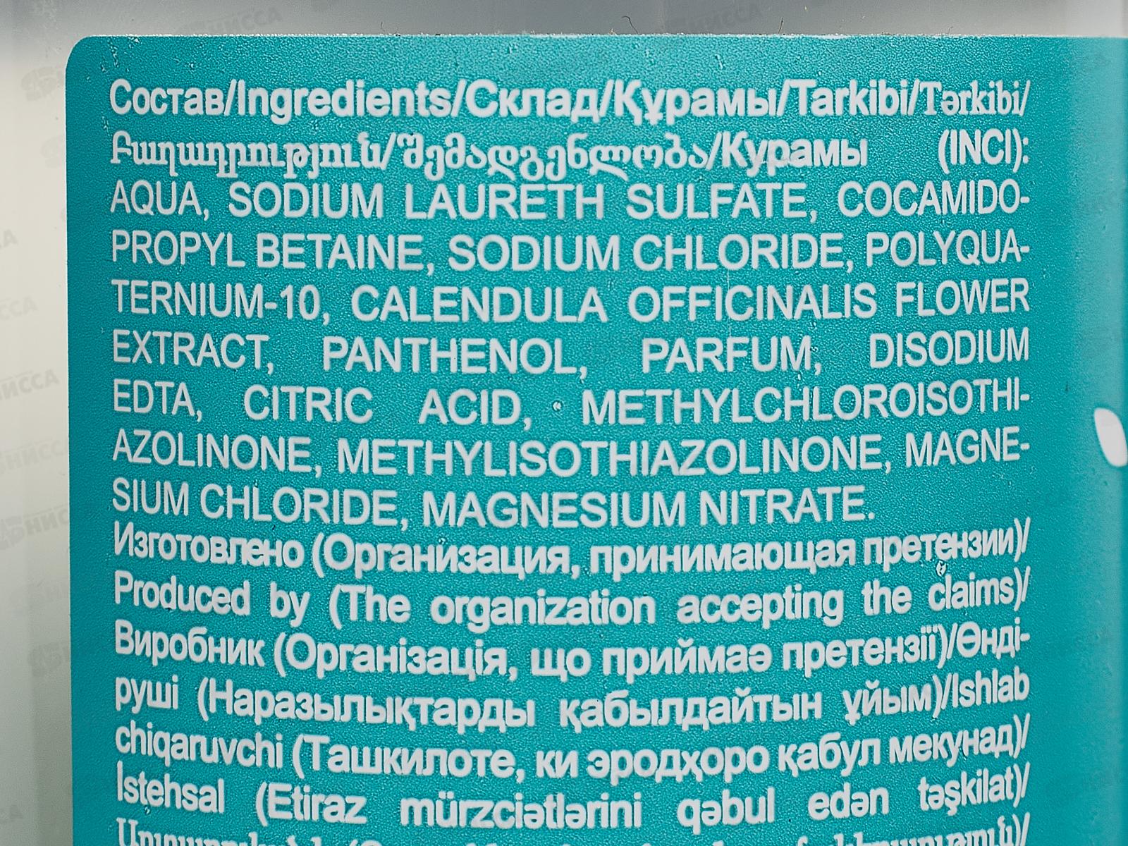 Состав: вода, хлорид натрия, поликватерниум-10, экстракт цветков календулы лекарственной, пантенол, отдушка, динатриевая ЭДТА, лимонная кислота, метилхлоризотиазолинон, метилизотиазолинон, хлорид магния, нитрат магния.
