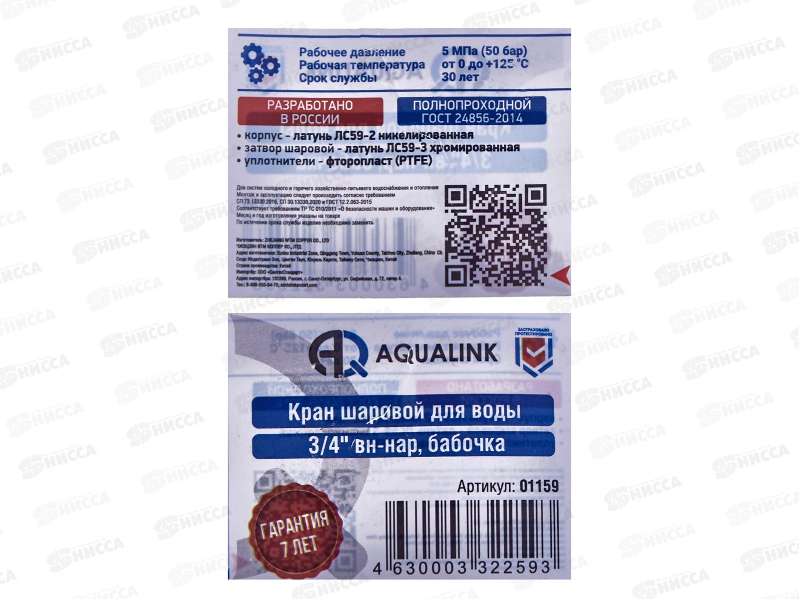 Кран шаровой Aqualink с внутренней и наружной резьбой дюймового размера 3/4" и ручкой-бабочкой 01159 - это высококачественное устройство для управления потоком жидкости. Изготовлен из прочных материалов, обеспечивает надежность и долговечность. Ручка-бабочка позволяет легко открывать и закрывать кран, а механизм шарового клапана гарантирует герметичность и плавное перемещение шарика. Идеально подходит для использования в системах водоснабжения, отопления или других технических системах.. Шар, шток и гайка сальника изготовлены из латуни ЛС59-3 (CW614N). Кольца седла и сальниковое уплотнение выполнены из фторопласта, который гарантирует высокий уровень герметичности. Полированный шар из хромированной латуни обеспечивает высокую износостойкость изделия в целом. Благодаря никелированию корпуса, шаровой кран Aqualink обладает повышенной устойчивостью к коррозии.