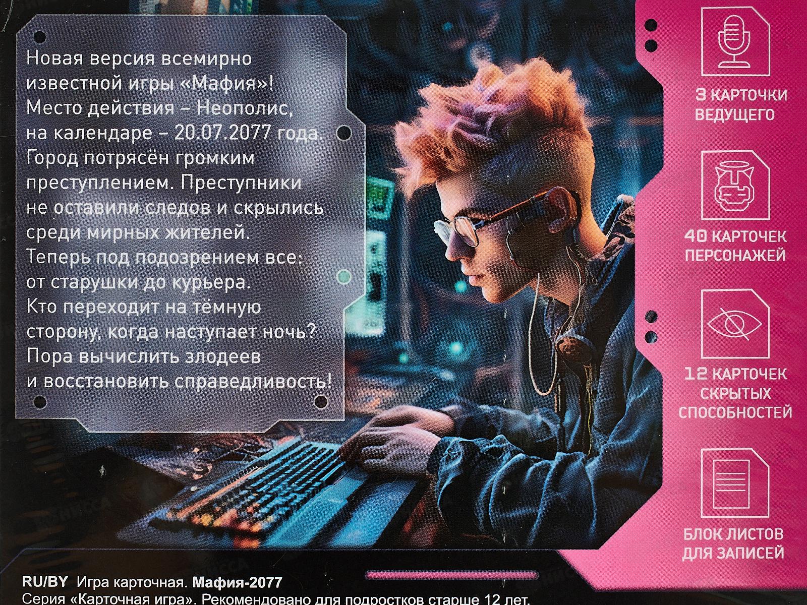 "Мафия-2077" – это новая версия всемирно известной игры с новыми возможностями! Задача игроков – вычислить злодеев в городе будущего. Здесь у каждого – своя цель, алиби и скрытая способность. Наблюдайте за подозреваемыми, используйте свои способности и принимайте решения, чтобы восстановить справедливость.