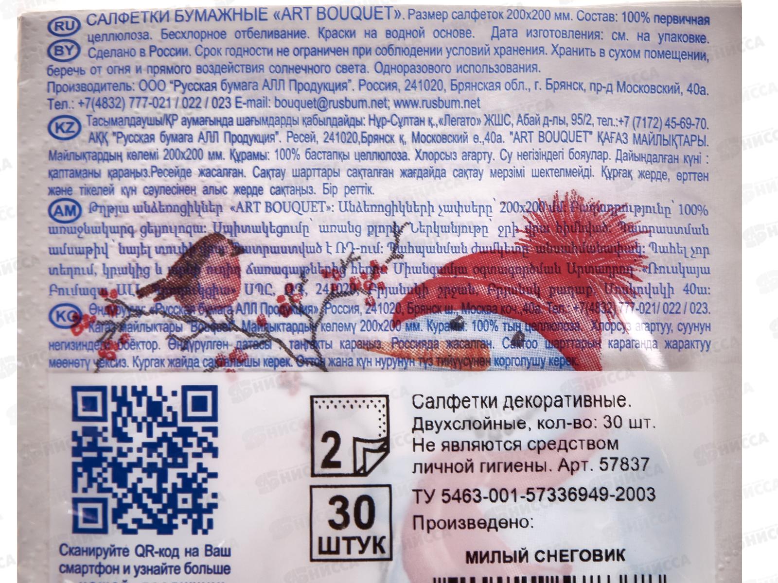 Салфетки 2 слойные 30 листов 20*20 Art Bouquet Милый снеговик,57837*26