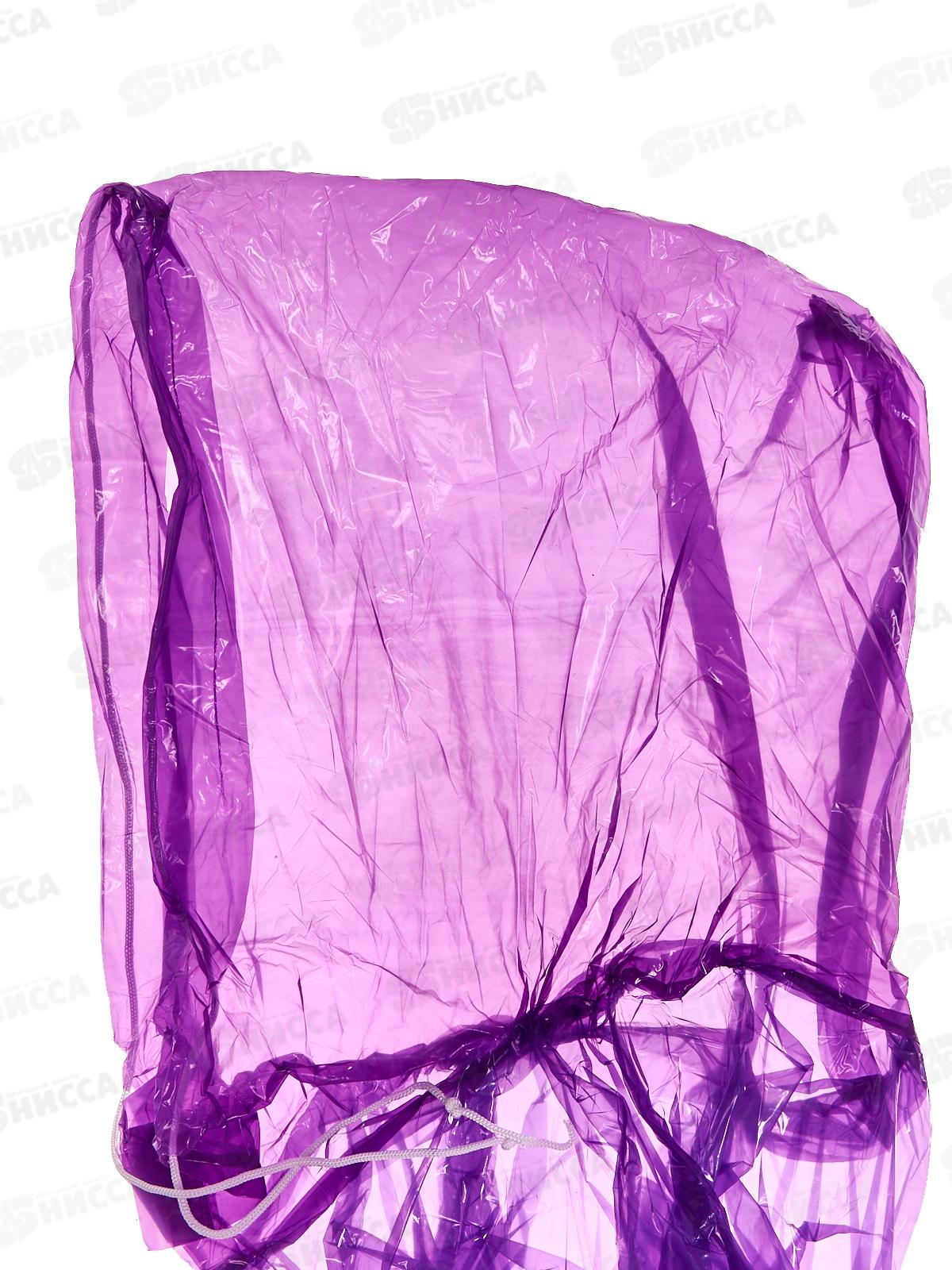 Дождевик-пончо фиолетового цвета из полиэтилена. Данный дождевик надевается через голову, и не имеет застежек, даже во время сильного ветра он не расстегнётся. Дождевик представлен увеличенного размера, что делает его свободным, не мешая вести активный образ жизни.