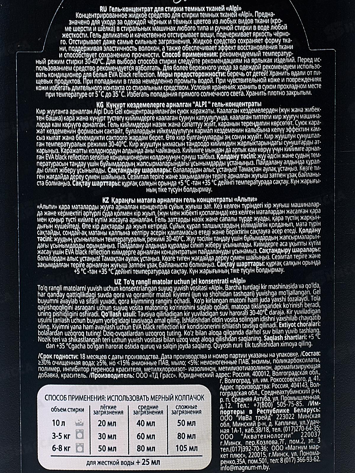 Концентрированное жидкое средство для стирки Alpi. Предназначено для ухода за одеждой чёрных и тёмных цветов из любых видов ткани (кроме шерсти и шёлка) в стиральных машинах любого типа и ручной стирки в воде любой жесткости. Гель деликатно и качественно отстирывает вещи, подчеркивает яркость чёрного. Отстирывает даже самые сильные загрязнения. Жидкое средство сохраняет форму ткани, поддерживая эластичность волокон, а также обеспечивает эффект восстановления ткани и способствует сохранению прочности. Состав: более 30% очищенная вода; более 5%, но <15% анионные ПАВ, мыло; <5%: неионогенные ПАВ, энзимы, поликарбоксилаты, полимер, ингибитор переноса красителя, метилхлороизотиазолинон, метилизотиазолинон, ароматизирующая добавка, краситель.