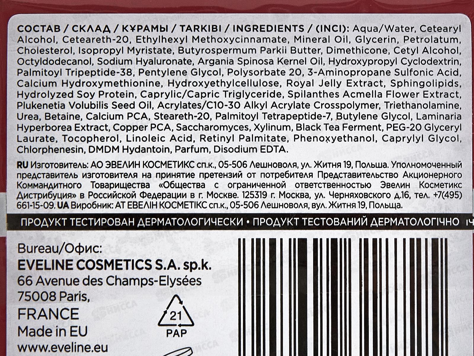 Состав: Aqua/Water, Cetearyl Alcohol, Ceteareth-20, Ethylhexyl Methoxycinnamate, Mineral Oil, Glycerin, Petrolatum, Cholesterol, Isopropyl Myristate, Butyrospermum Parkii Butter, Dimethicone, Cetyl Alcohol, Octyldodecanol, Sodium Hyaluronate, Argania Spinosa Kernel Oil, Hydroxypropyl Cyclodextrin, Palmitoyl Tripeptide-38, Pentylene Glycol, Polysorbate 20, 3-Aminopropane Sulfonic Acid, Calcium Hydroxymethionine, Hydroxyethylcellulose, Royal Jelly Extract, Sphingolipids, Hydrolyzed Soy Protein, Caprylic/Capric Triglyceride, Spilanthes Acmella Flower Extract, Plukenetia Volubilis Seed Oil, Acrylates/C10-30 Alkyl Acrylate Crosspolymer, Triethanolamine, Urea, Betaine, Calcium PCA, Steareth-20, Palmitoyl Tetrapeptide-7, Butylene Glycol, Laminaria Hyperborea Extract, Copper PCA, Saccharomyces, Xylinum, Black Tea Ferment, PEG-20 Glyceryl Laurate, Tocopherol, Linoleic Acid, Retinyl Palmitate, Phenoxyethanol, Caprylyl Glycol, Chlorphenesin, DMDM Hydantoin, Parfum, Disodium EDTA