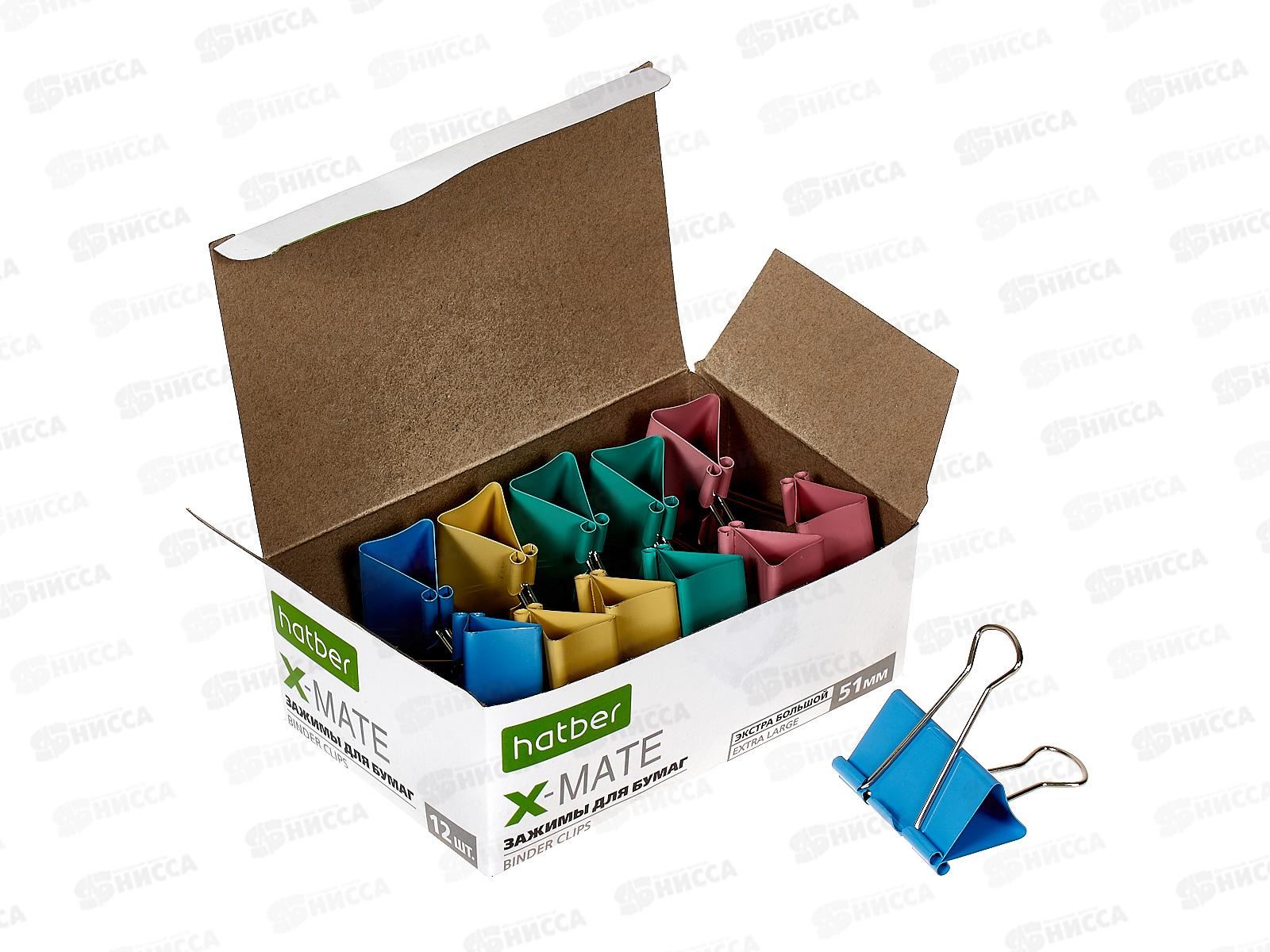 Зажим д/бумаг 51мм 12шт Hatber Х-Мэйт цветн, 083720*12/60