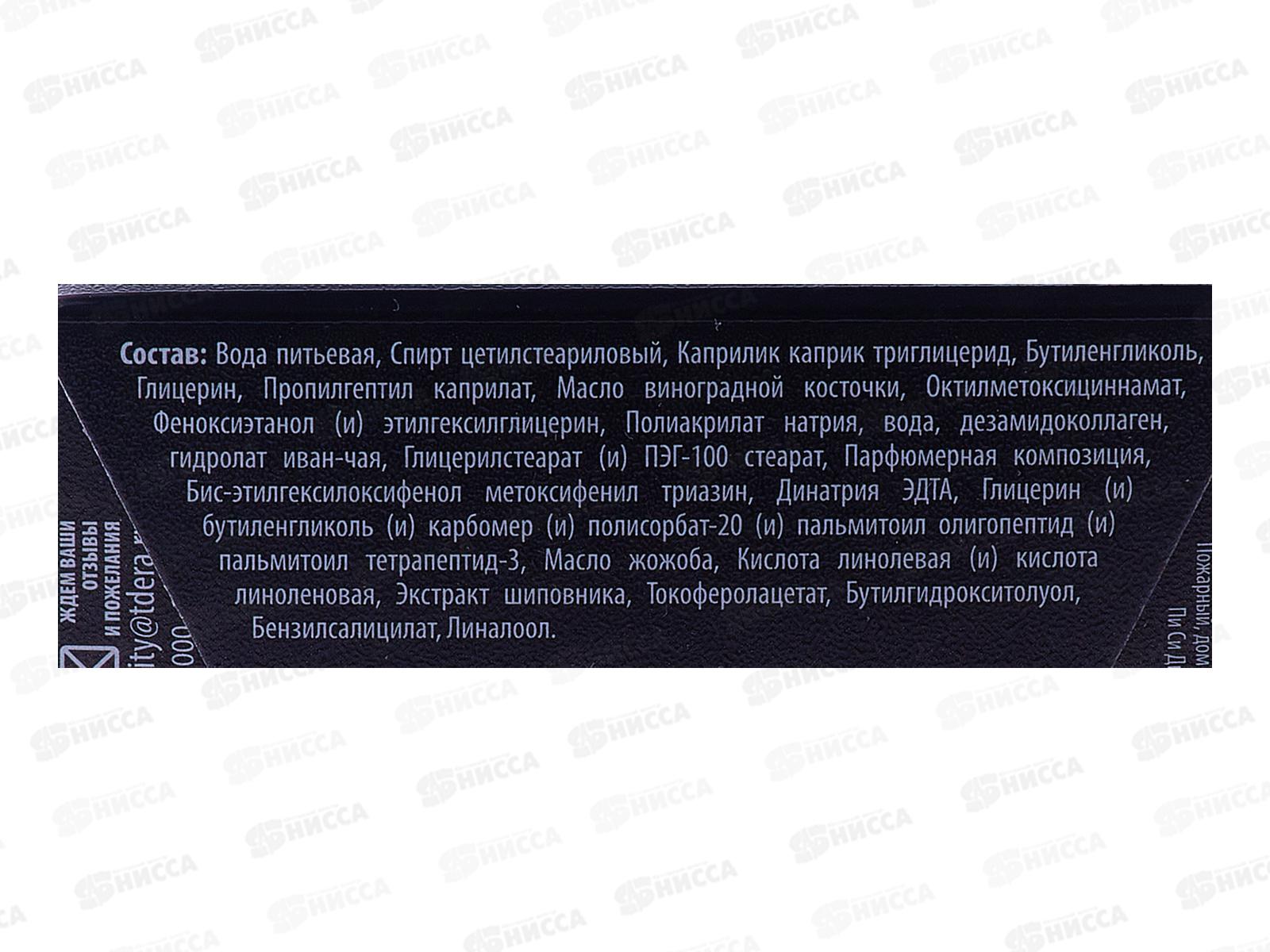 Состав: вода питьевая, Глицерилстеарат; цетеарет-20, цетеарет-12, Глицерин; цетеариловый спирт, цетилпальмитат; Изопропилпальмитат, Пропилгептил каприлат; пэг-40 гидрогенизированное касторовое масло; Дикаприлил карбонат, Спирт цетилстеариловый; каприлик каприк триглицерид; бутиленгликоль; масло виноградной косточки; октилметоксициннамат; Феноксиэтанол, этилгексилглицерин; Полиакрилат натрия, дезамидоколлаген; гидролат иван-чая, Парфюмерная композиция; бис-этилгексилоксифенол метоксифенил триазин; Динатрия ЭДТА, карбомер, полисорбат-20; пальмитоил олигопептид, пальмитоил тетрапептид-3; Масло жожоба, Экстракт шиповника; Кислота линолевая, кислота линоленовая; Токоферолацетат, Бутилгидрокситолуол; бензилсалицилат, линалоол.