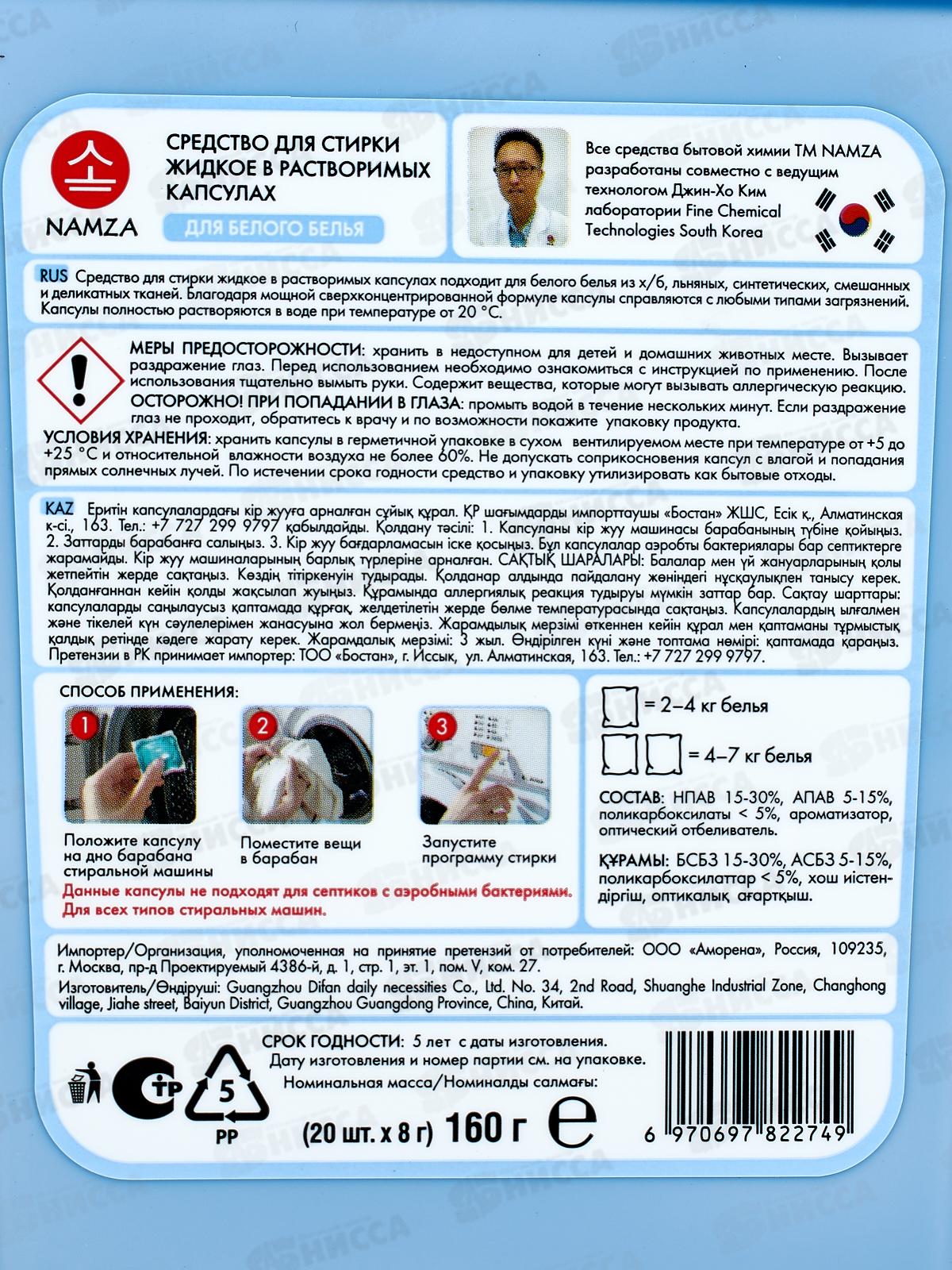 NAMZA Средство для стирки жидкое в капсулах Для белого 20шт 160г *14 2749