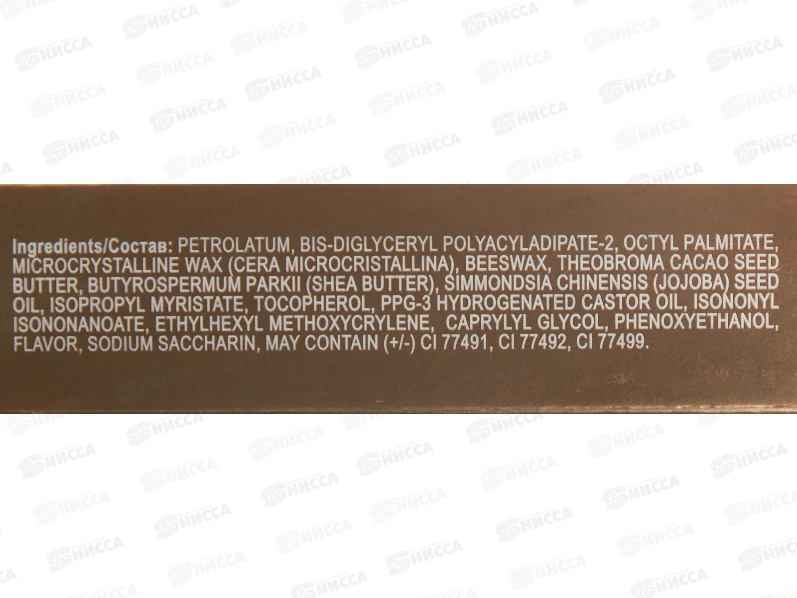 Состав: вазелин, бис-диглицерилполиациладипат-2, октилпальмитат, микрокристаллический воск (Cera Microcristallina), пчелиный воск, масло семян какао Theobroma, масло ши Butyrospermum Parkii, масло семян жожоба Simmondsia Chinese, изопропилмиристат, токоферол, гидрогенизированное касторовое масло PPG-3, изононилизононаноат, этилгексилметоксикрилен, каприлилгликоль, феноксиэтанол, ароматизатор, сахарин натрия, может содержать (+/-) CI 77491, 77492, C1 77499.