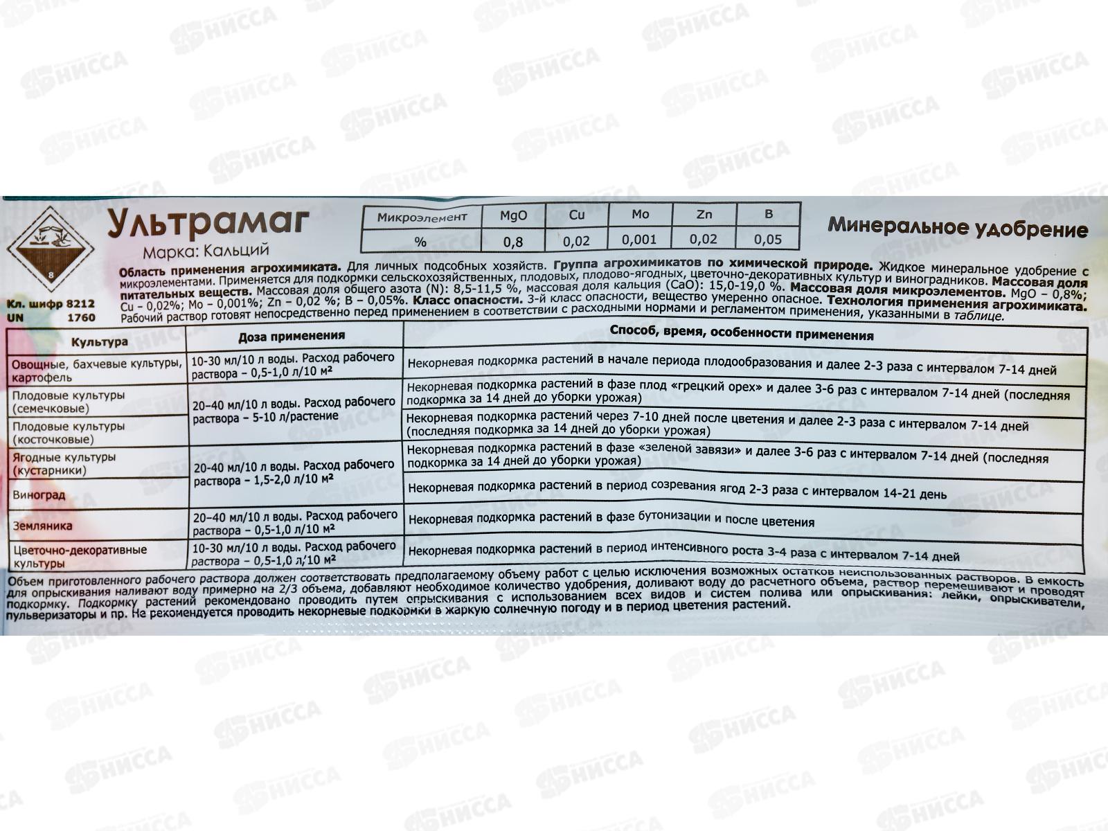«Ультрамаг Кальций» – жидкое минеральное микроудобрение для улучшения качества и сохранности плодов. Кальций отлично усваивается при некорневых подкормках. Этот элемент особенно необходим растениям в фазе образования завязей и созревания плодов. «Ультрамаг Кальций» используется для подкормок любых культур – овощных, косточковых и семечковых плодовых, ягодных и цветочно-декоративных. В его состав входит не только кальций как основной элемент, но и азот, магний, медь, молибден, цинк и бор. Элементы в «правильной» пропорции не угнетают, а усиливают эффект друг друга. Поэтому растения получают сбалансированное внекорневое питание. Состав: азота (N) не менее 10,0%, кальция (СаО), не менее 17,0%, магния (МgО), не менее 0,8%. Микроэлементов, % не менее: цинк (Zn) - 0,02, медь (Cu) - 0,02, бор (B) - 0,05, молибден (Mo) - 0,001.