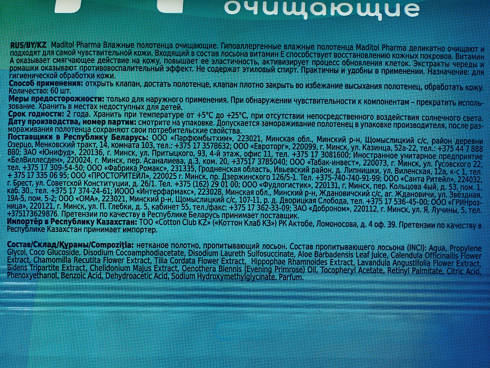 Состав: нетканое полотно, пропитывающий лосьон. Состав пропитывающего лосьона: Вода, Пропиленгликоль, Кокосовый глюкозид, Динатриевый кокоамфодиацетат, Динатриевый лауретсульфосукцинат, Сок листьев Алоэ Барбадосского, Экстракт цветков календулы лекарственной, экстракт цветков ромашки прямостоячей, экстракт цветков Тилии сердцевидной, Экстракт бегемота Рамноидного, экстракт цветков лаванды узколистной, экстракт двудомника трехраздельного, Экстракт Хелидония Большого, Масло Энотеры двудомной (примулы вечерней), Токоферилацетат, Ретинилпальмитат, Лимонная кислота, Феноксиэтанол, Бензойная кислота, Дегидроуксусная кислота, гидроксиметилглицинат натрия, Парфюмированная вода.