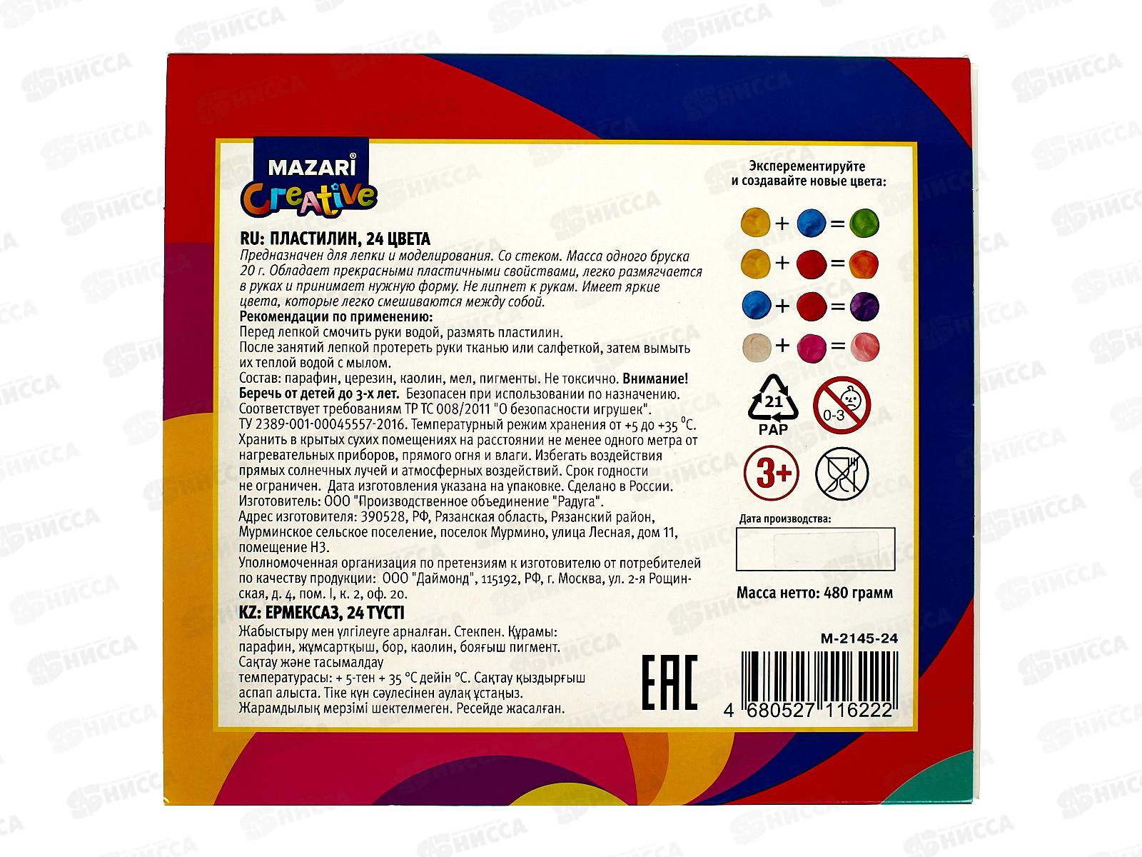 Пластилин 24цвета 480г MAZARI Классический М-2145-24*10