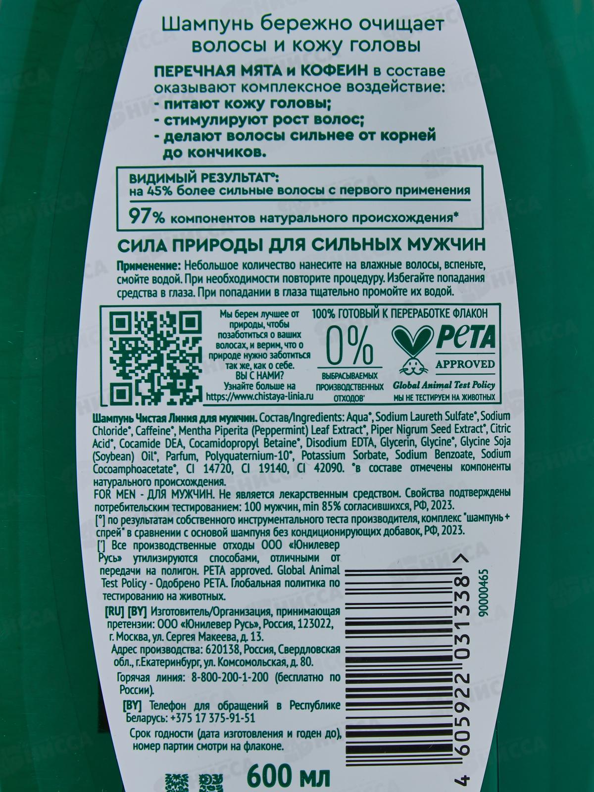 Концерн Калина Чистая Линия шампунь 600мл Для мужчин *6