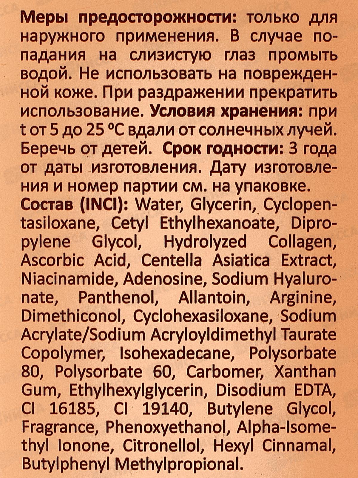 Состав: вода, Глицерин, Циклопентасилоксан, Цетилэтилгексаноат, Дипропиленгликоль, Гидролизованный коллаген, Аскорбиновая кислота, Экстракт центеллы азиатской, Ниацинамид, Аденозин, Гиалуронат натрия, Пантенол, Аллантоин, Аргинин, Диметиконол, Циклогексасилоксан, Сополимер акрилата натрия/акрилоилдиметилтаурата натрия, Изогексадекан, Полисорбат 80, Полисорбат 60, Карбомер, Ксантановая камедь, Этилгексилглицерин, Динатриевая ЭДТА, CI 16185, CI 19140, Бутиленгликоль, отдушка, Феноксиэтанол, Альфа-изометилионон, Цитронеллол, Гексилциннамаль, Бутилфенилметилпропиональ.