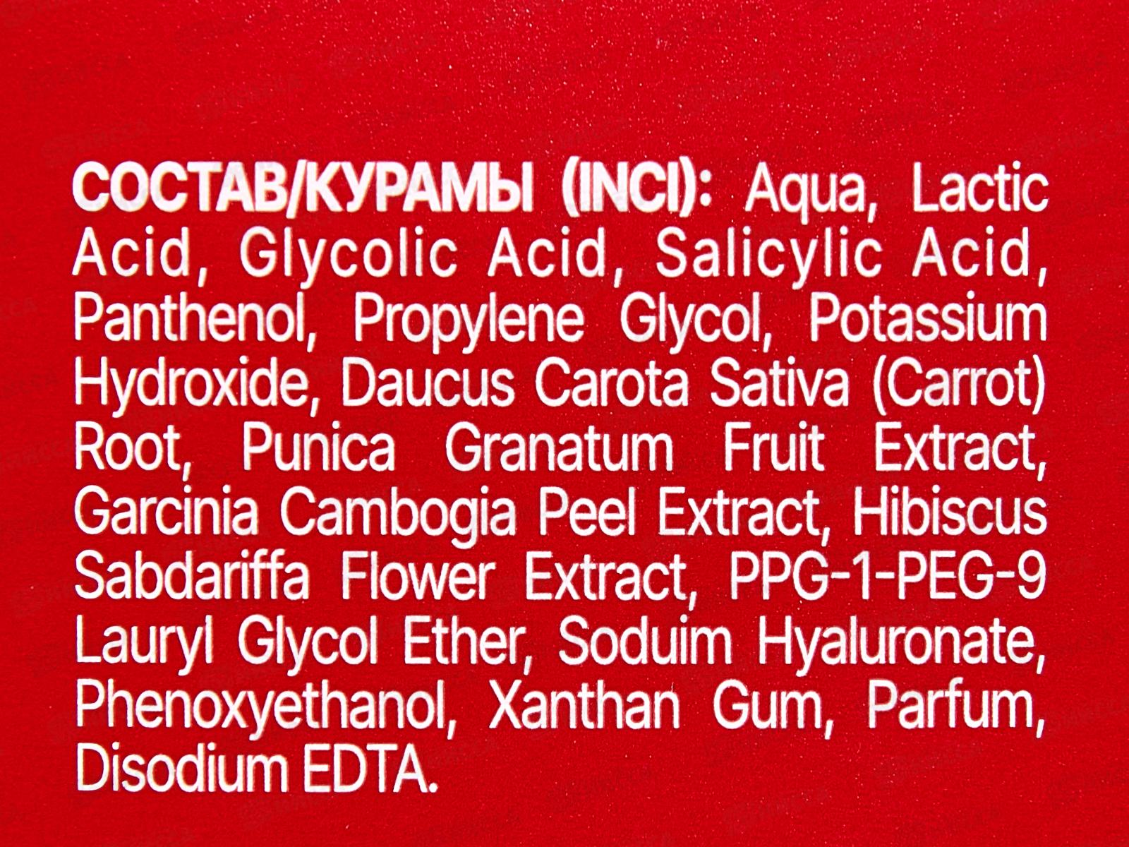 Состав: вода, молочная кислота, Гликолевая кислота, салициловая кислота, Пантенол, пропиленгликоль, гидроксид калия, Корень Каротина посативного (Морковь), Экстракт плодов Пуники Гранатум, Экстракт кожуры гарцинии камбоджийской, Экстракт цветков гибискуса Сабдариффы, эфир лаурилгликоля PPG-1-PEG-9, Содуим гиалуронат, феноксиэтанол, ксантановая камедь, парфюмированная вода, Динатриевый ЭДТА.