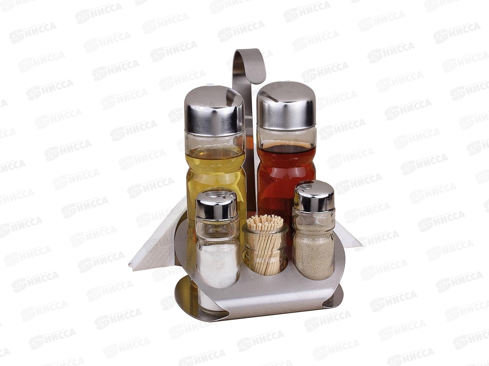 Набор для специй 93-DE-AR-19 включает в себя 2 баночки для сыпучих специй, две баночки для масла, соевого соуса и прочих продуктов, а также подставку для зубочисток и для салфеток.