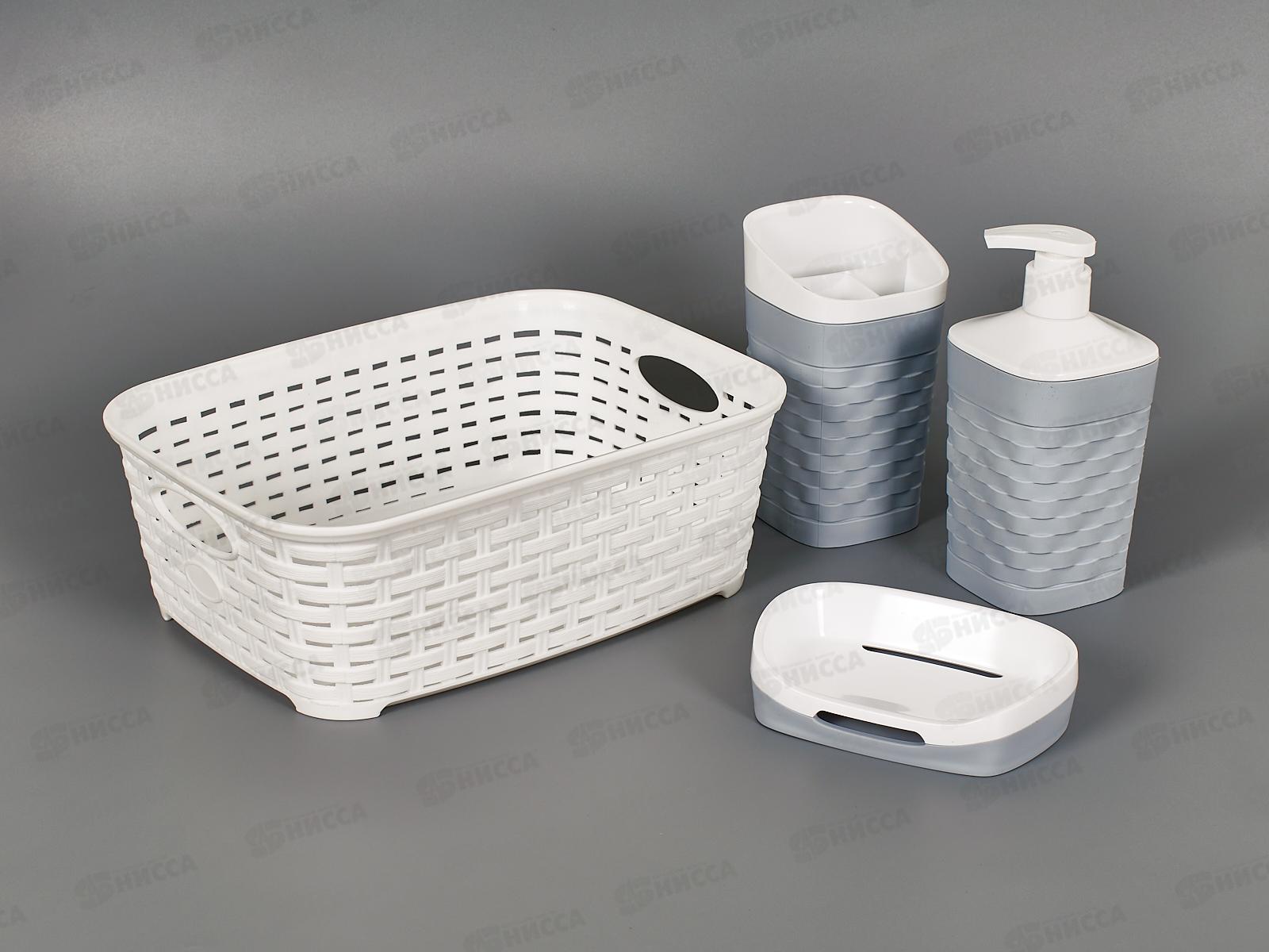 Состав набора: диспенсер для жидкого мыла, стакан для зубных щеток, мыльница, корзинка.