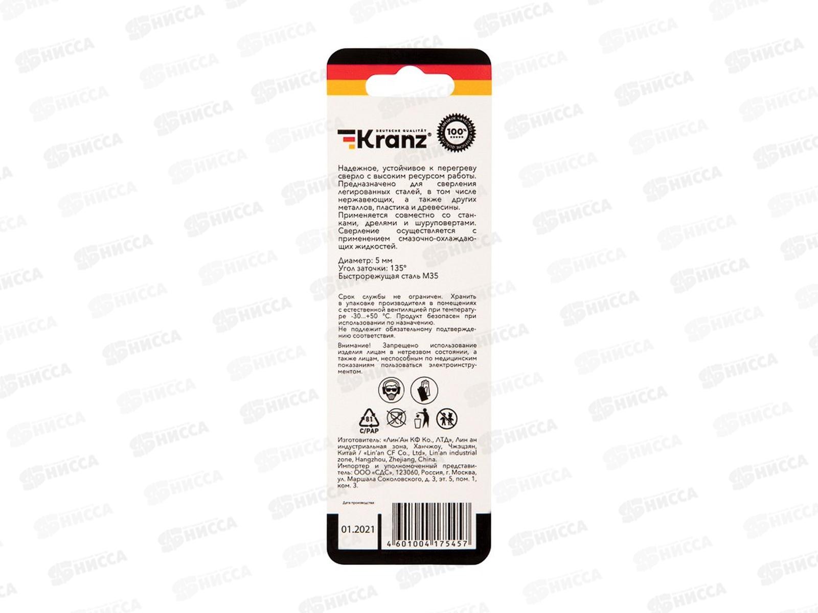 Сверло по металлу 5х86х52мм Кобальт (сталь HSS-Co 5% M35 P6M5K5) DIN 338, 1 шт. в блистере KRANZ, KR-91-0507