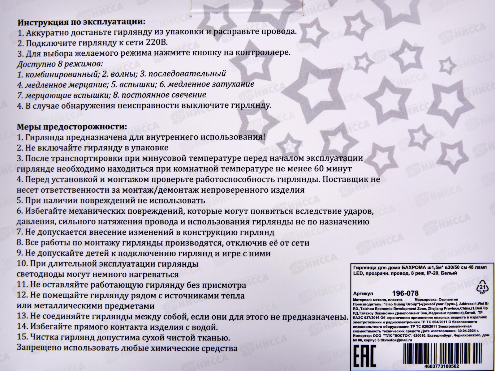 Гирлянда 1,5м*50см Бахрома 48LED белый 196-078