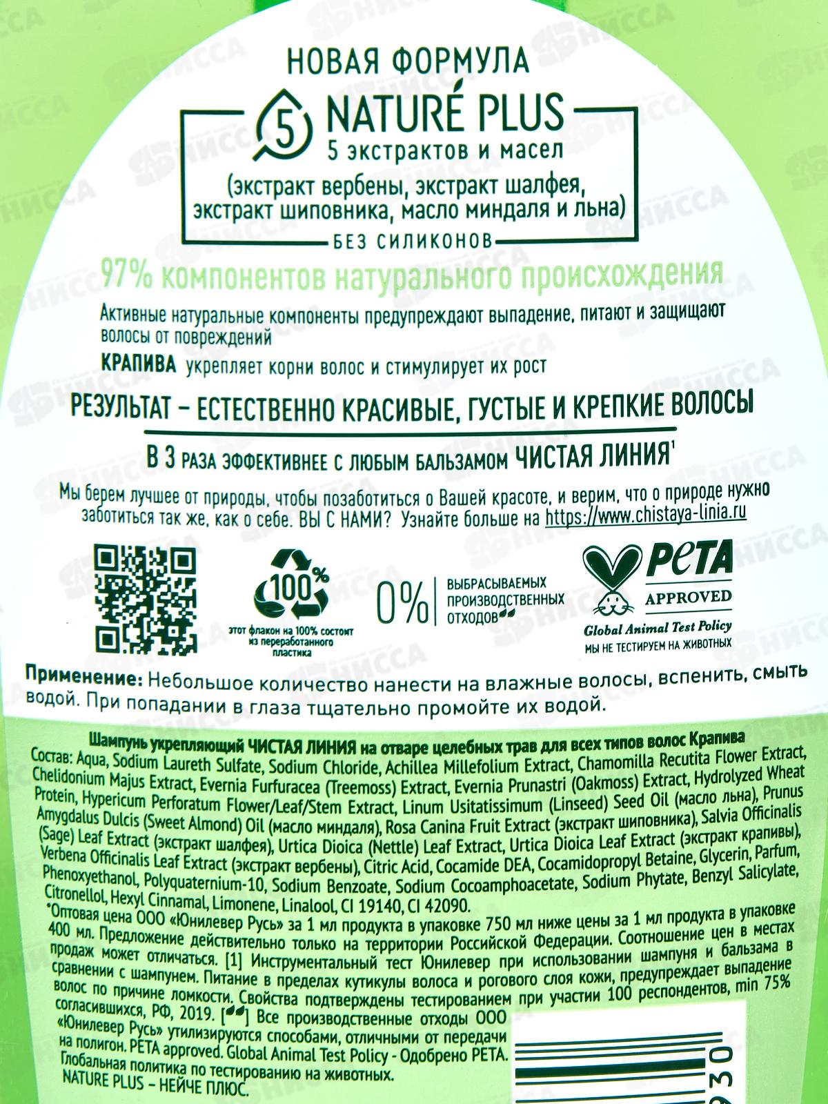 Концерн Калина Чистая Линия шампунь 750мл Укрепление на отваре целебных трав Крапива *8