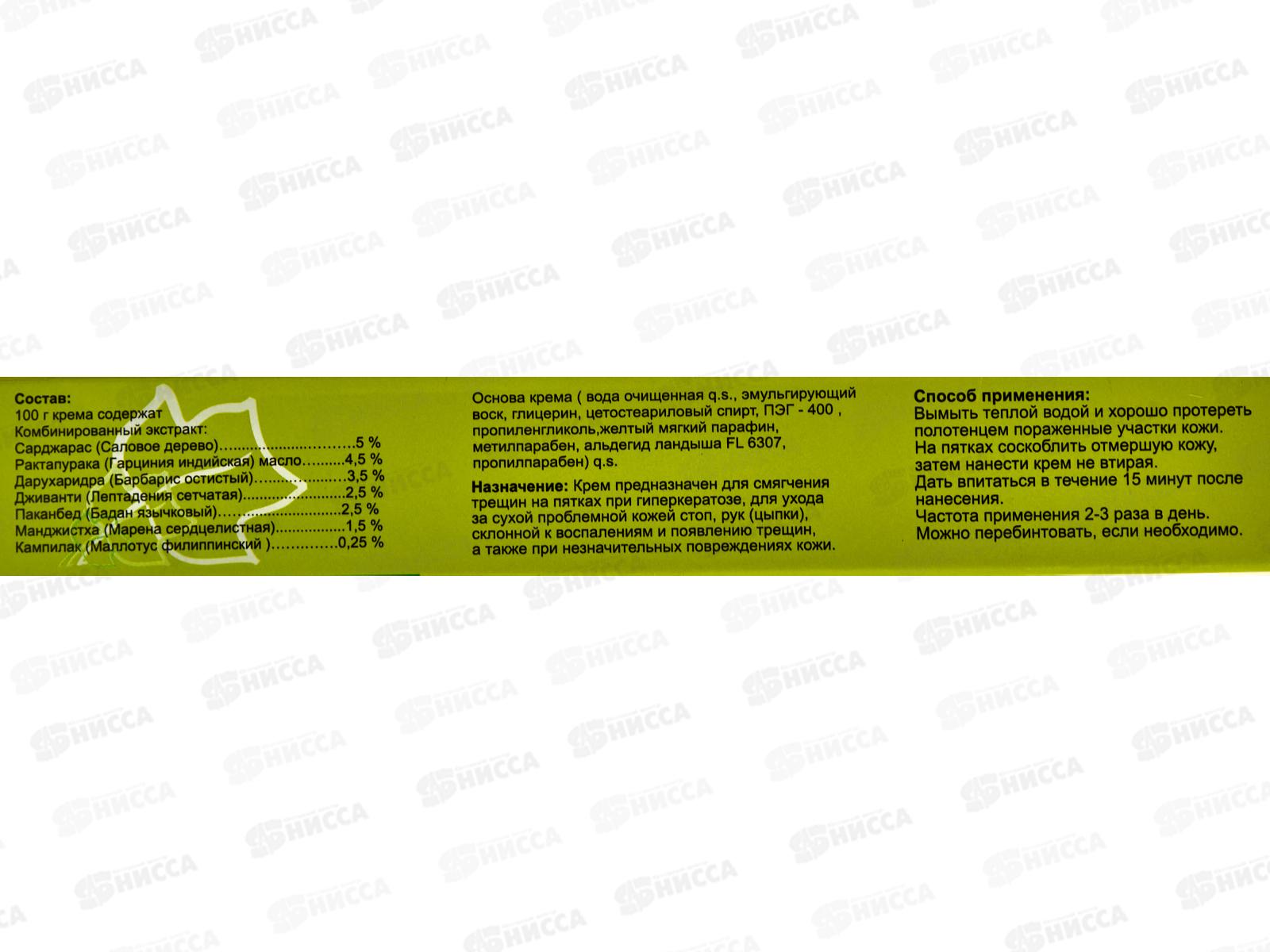 Сама природа заботится о Ваших ногах! Сила и нежность 7 целебных растений из Золотого ряда Аюрведы для мягкости Ваших ног! Растительный крем для ухода за кожей стоп, содержит комбинированные экстракты натуральных трав, смягчает и заживляет трещины, снимает воспаление и боль, а также увлажняет и питает кожу стоп. Состав: Комбинированный экстракт: Сарджарас (саловое дерево) 5%, рактапурака (гарциния индийчкая ) масло 4,5%, дарухаридра (барбарис остистый) 3,5 %, джаванти (лептадения сетчатая 2,5 % паканбед (бадан язычковый )2,5 %, манджистха (марена сердцелистная) 1,5 %, кампилак (маллотус филлипинский) 0,25 %, основа крема.