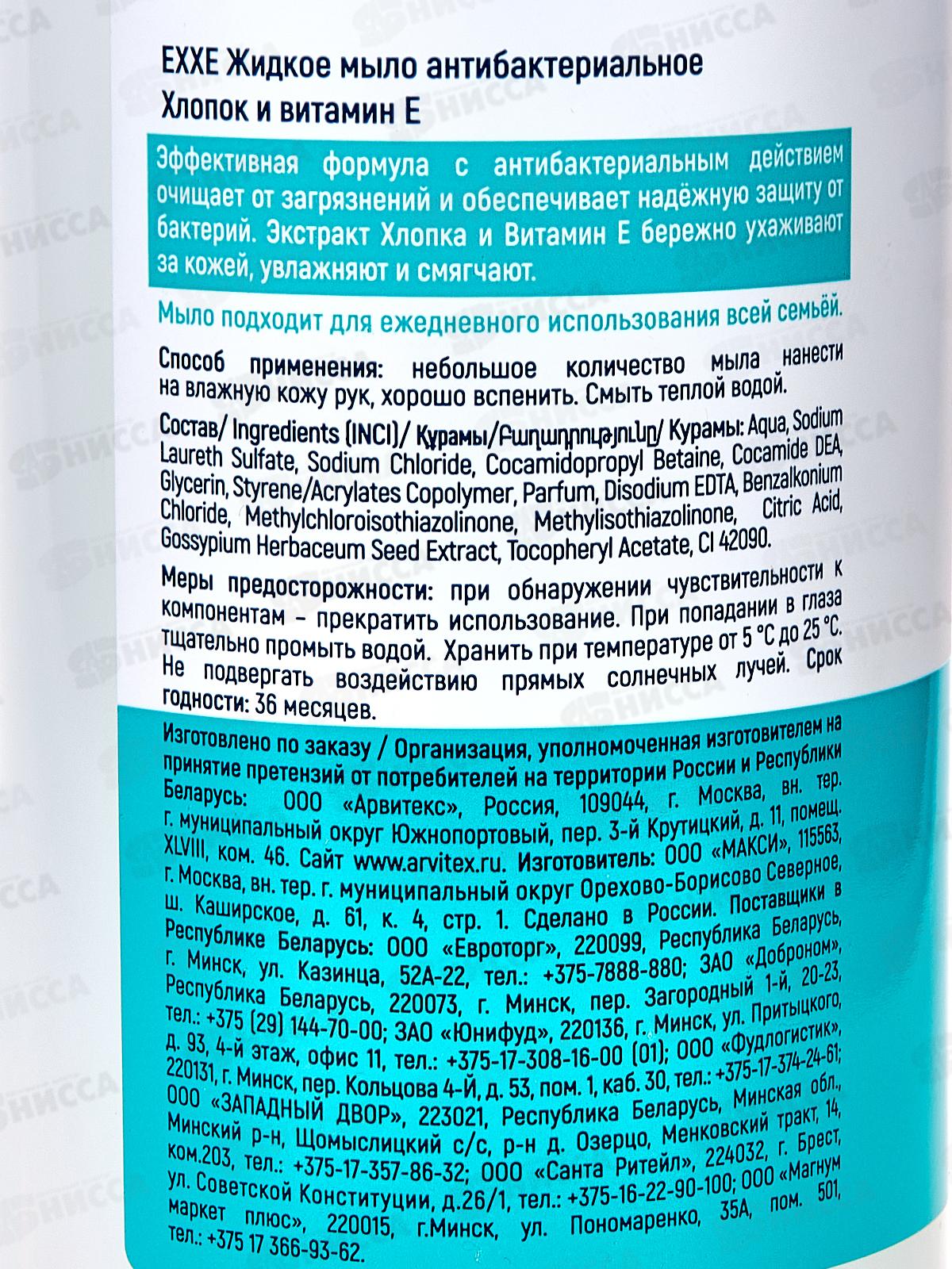 EXXE Жидкое мыло "Хлопок и Витамин Е" антиб 500мл С0008027 *12