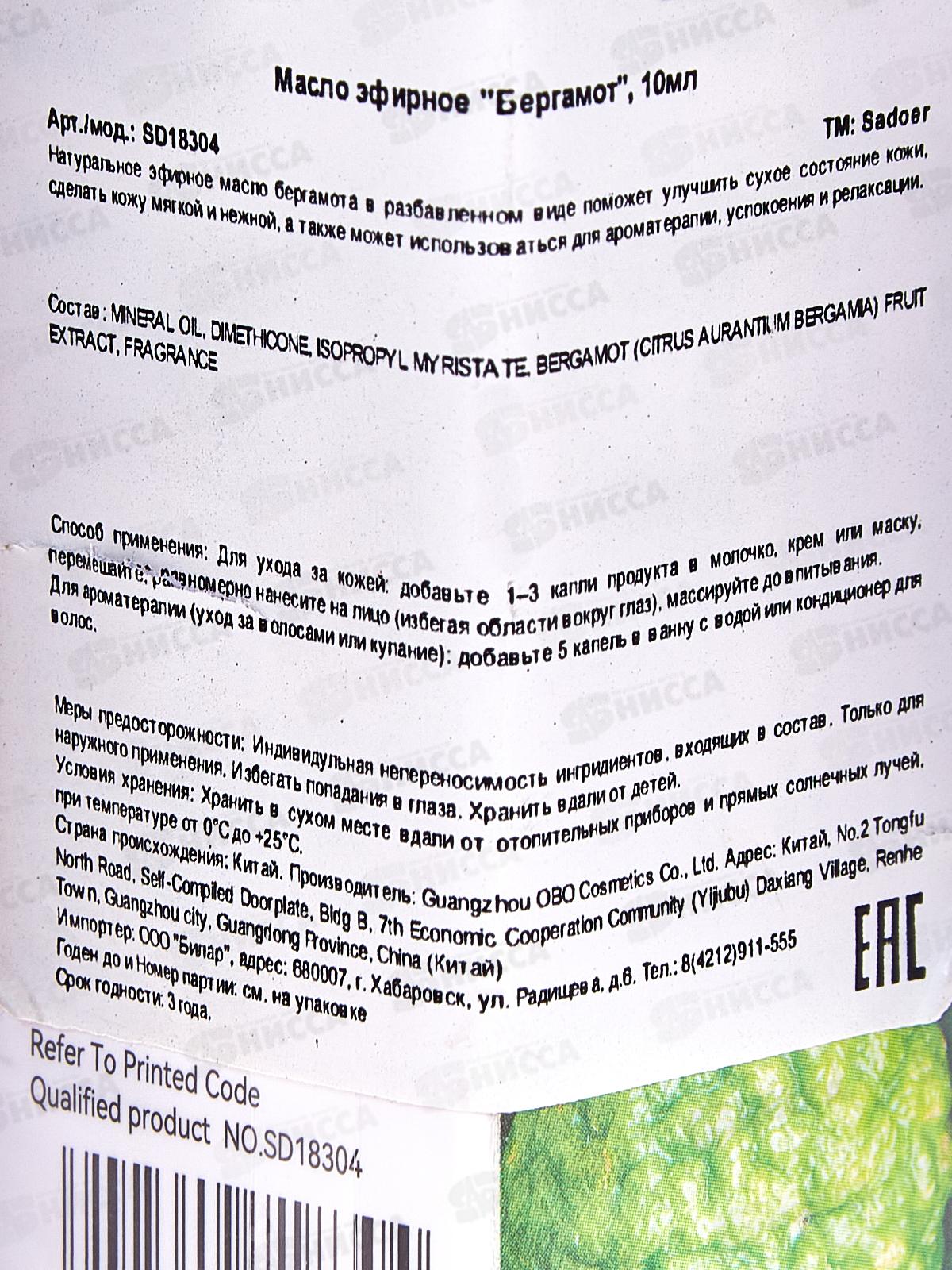 Sadoer аромамасло смягч для лица тела волос 10мл Бергамот