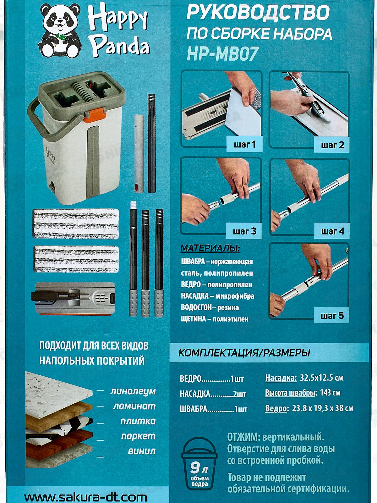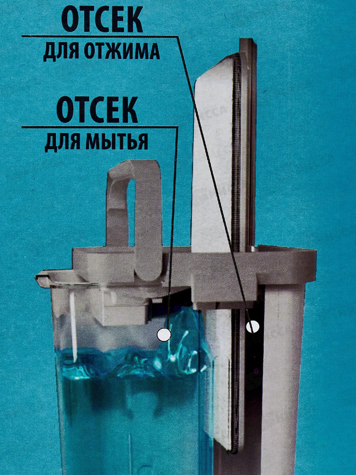 Комплектация: 2-камерное ведро с механизмом отжатия, насадка на липучке (материал микрофибра) + 2 сменные насадки. Особенности: уникальная система полоскания и отжима, позволяют полностью удалять грязь с насадки, швабра легко проходит под мебелью, хорошо удаляет шерсть животных и волосы, слив воды происходит через сливное отверстие в ведре.