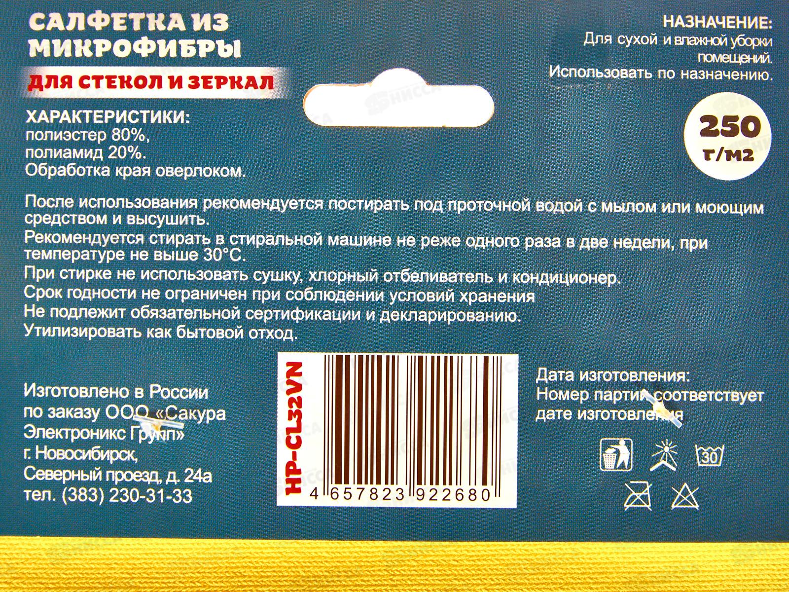 Салфетка HP-CL32VN для стекол и зеркал микрофибра 30*30см *70