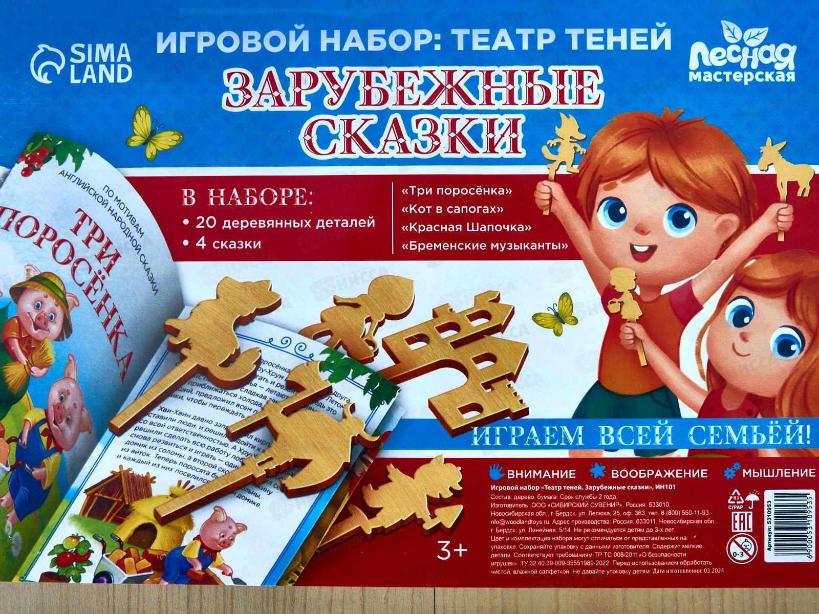 Комплектация: 20 деревянных деталей, книжка с 4 сказками