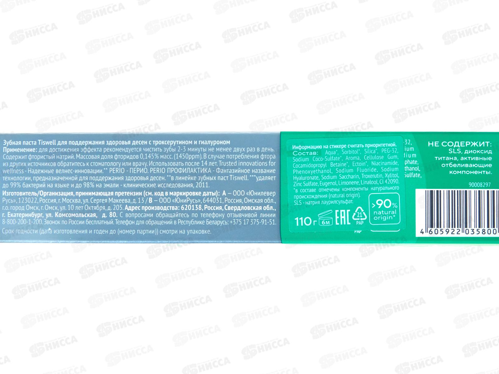 Зубная паста Tiswell с троксерутином и гиалуроном – это эффективное средство для поддержания здоровья десен. Продукт укрепляет десны, снижая их отечность и кровоточивость. Состав: Вода, сорбит, диоксид кремния, ПЭГ-32, Коксульфат натрия, Ароматизатор, Целлюлозная камедь, Кокамидопропилбетаин, Эктоин, Ниацинамид, феноксиэтанол, фторид натрия, Гиалуронат натрия, Сахарин натрия, Троксерутин, Ксилит, Сульфат цинка, Эвгенол, Лимонен, Линалоол, CI 42090.