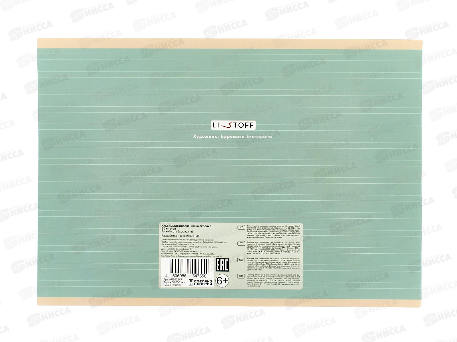 Альбом д/рис.30л ЭКСМ Рыжий кот. скрепка. мел.картон АЛ302547 *50