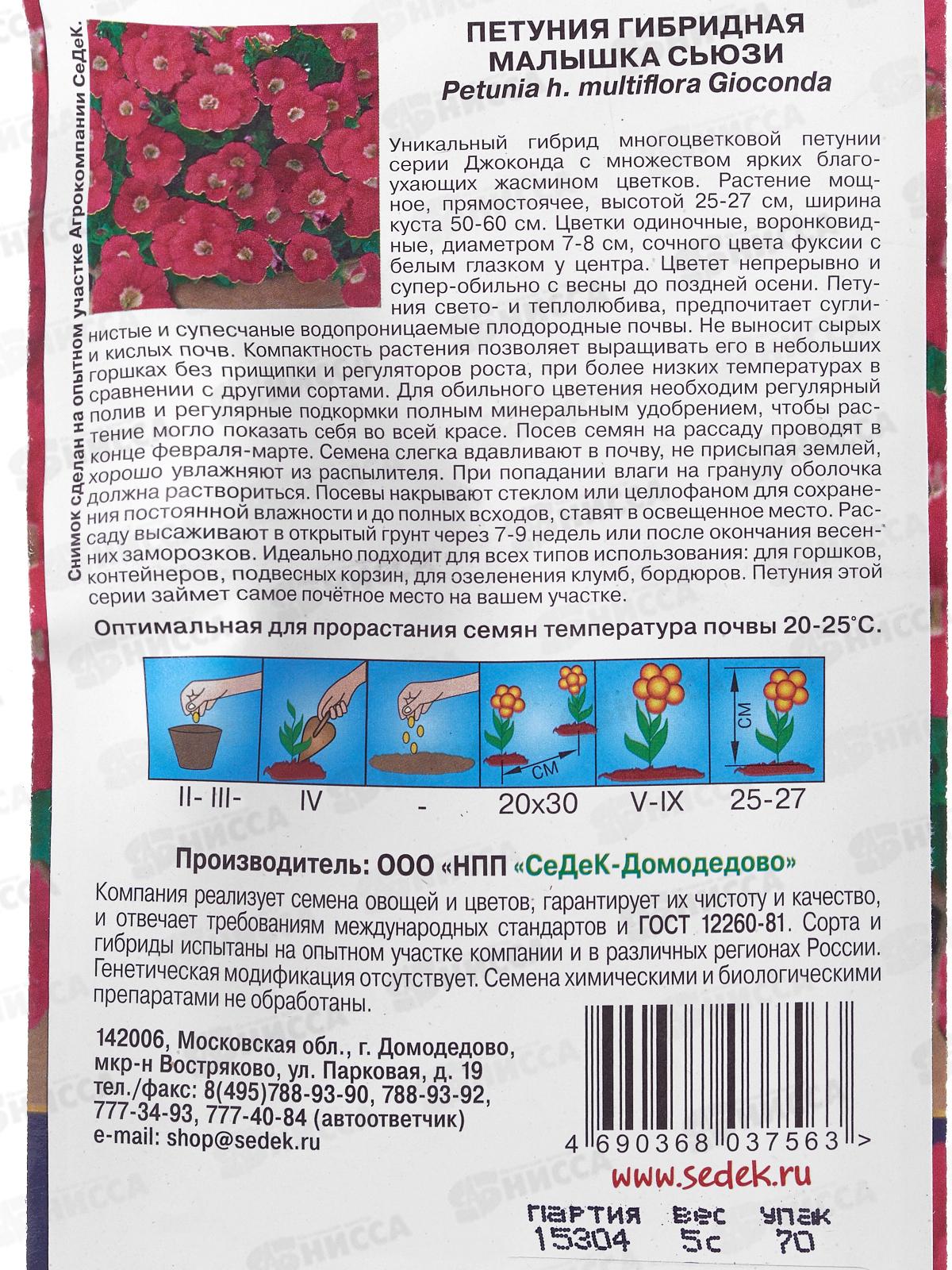 Уникальный гибрид многоцветковой петунии серии Джоконда с множеством ярких благоухающих жасмином цветков. Растение мощное, прямостоячее, высотой 25-27 см, ширина куста 50-60 см. Цветки одиночные, воронковидные, диаметром 7-8 см, сочного цвета фуксии с белым глазком у центра. Цветет непрерывно и супер-обильно с весны до поздней осени. Петуния свето- и теплолюбива, предпочитает суглинистые и супесчаные водопроницаемые плодородные почвы. Не выносит сырых и кислых почв. Компактность растения позволяет выращивать его в небольших горшках без прищипки и регуляторов роста, при более низких температурах в сравнении с другими сортами. Для обильного цветения необходим регулярный полив и регулярные подкормки полным минеральным удобрением, чтобы растение могло показать себя во всей красе. Посев семян на рассаду проводят в конце февраля-марте. Семена слегка вдавливают в почву, не присыпая землей, хорошо увлажняют из распылителя. При попадании влаги на гранулу оболочка должна раствориться. Посевы накрывают стеклом или целлофаном для сохранения постоянной влажности и до полных всходов, ставят в освещенное место. Рассаду высаживают в открытый грунт через 7-9 недель или после окончания весенних заморозков. Идеально подходит для всех типов использования: для горшков, контейнеров, подвесных корзин, для озеленения клумб, бордюров. Петуния этой серии займет самое почётное место на вашем участке.