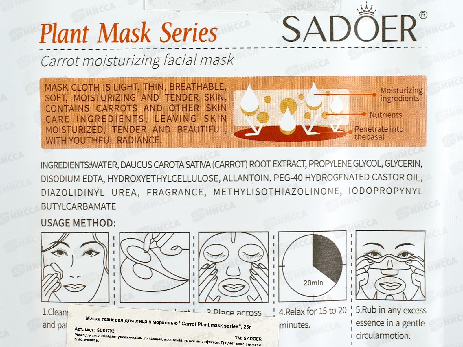 Омолаживающая тканевая маска для лица Sadoer с экстрактом моркови увлажняет, смягчает и витаминизирует кожу. Экстракт моркови в составе средства - природный антиоксидант, который защищает клетки от воздействий свободных радикалов, в результате чего клетки регенерируются, омолаживая и восстанавливая кожный покров. Бета-каротин снижает чувствительность кожи к ультрафиолетовым излучениям. Действие этого вещества в разы усиливается в присутствии витамина С и Е. Каротин увлажняет и смягчает кожу, тонизирует. Также повышает способность кожи вырабатывать коллаген, который отвечает за регенерацию клеток и восстановление кожного покрова. Экстракт моркови бережно осветляет кожу, выравнивает тон, улучшает цвет лица. Экстракт борется с первыми признаками старения, устраняет морщины, разглаживая их, восстанавливает базальный слой кожи. Маска смягчает обезвоженную, сухую кожу, напитывая необходимым количеством влаги. Придает увядающей и усталой коже сияние и здоровый вид, подтягивая и омолаживая ее. Средство имеет противовоспалительное воздействие, устраняет сухость. Состав: Water, Daucus carota sativa (carrot) root extract, Propylene glycol, Glycerin, Disodium EDTA, Hydroxyethyl cellulose, Allantoin, Peg-40 hydrogenated castor oil. Other trace components: Diazolidinyl urea, Fragrance, Methylisothiazolinone, Iodopropynyl butylcarbamate.