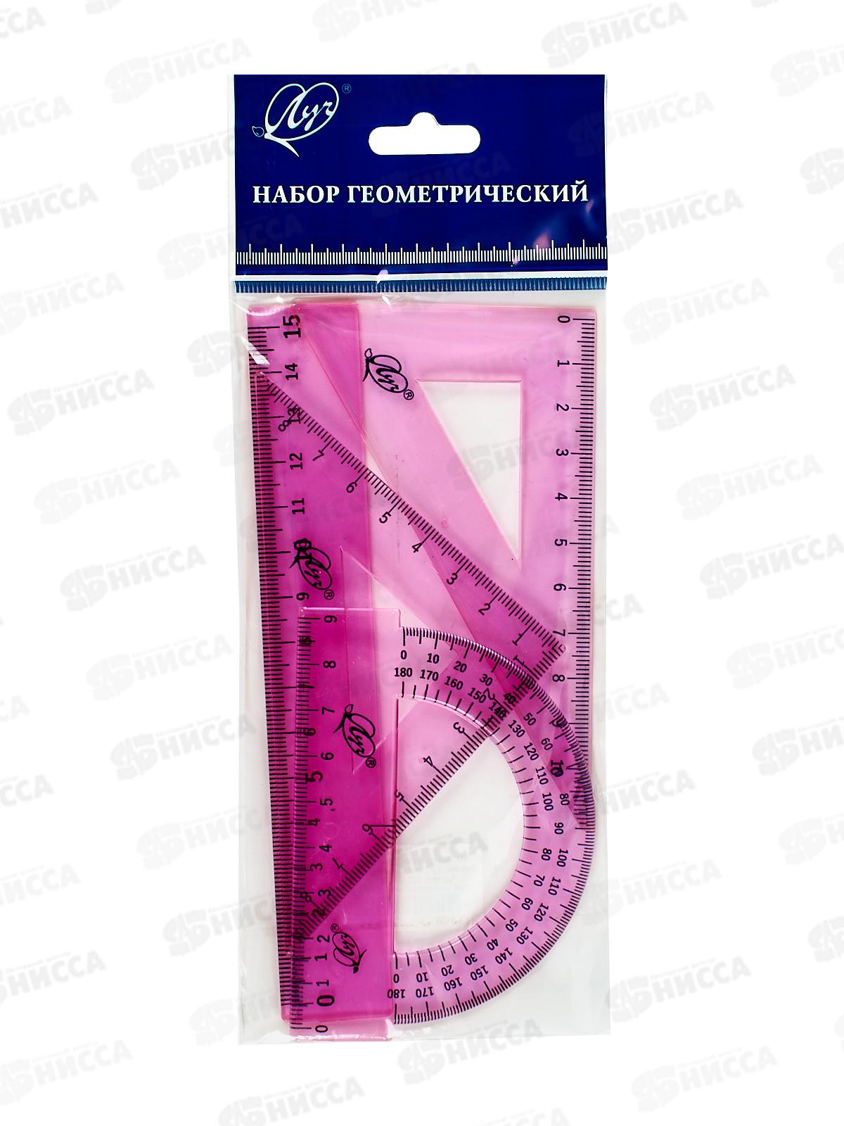 Геометрический набор линеек ЛУЧ предназначен школьникам, студентам, сотрудникам офисов - всем, кто работает с чертежами, таблицами и рисунками. Линейки изготовлены из высококачественного пластика. Четкая печать односторонней шкалы. Упаковка: прозрачный пакет с подвесом.