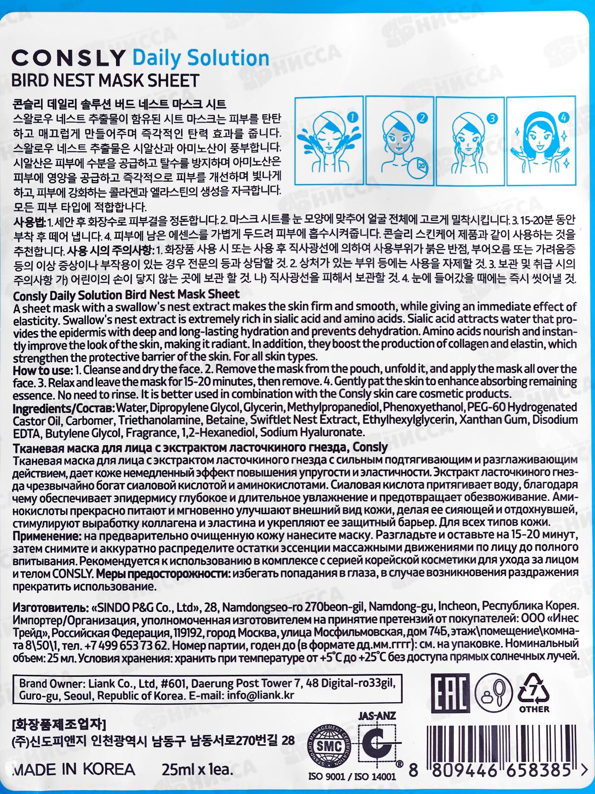 Consly Маска тканевая для лица с экстрактом ласточкиного гнезда 25мл