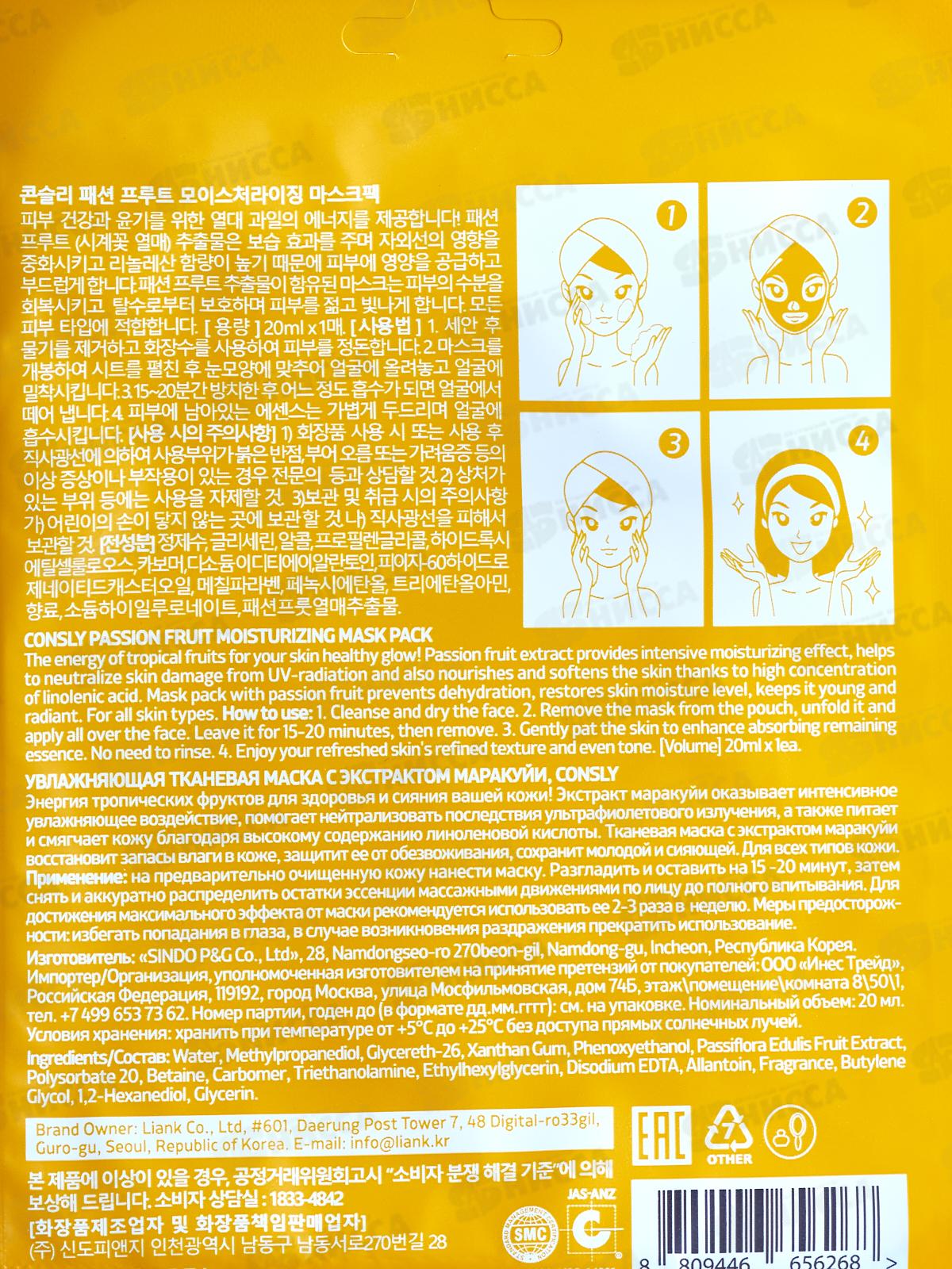 Consly Маска тканевая увлажняющая с экстрактом маракуйи 20мл