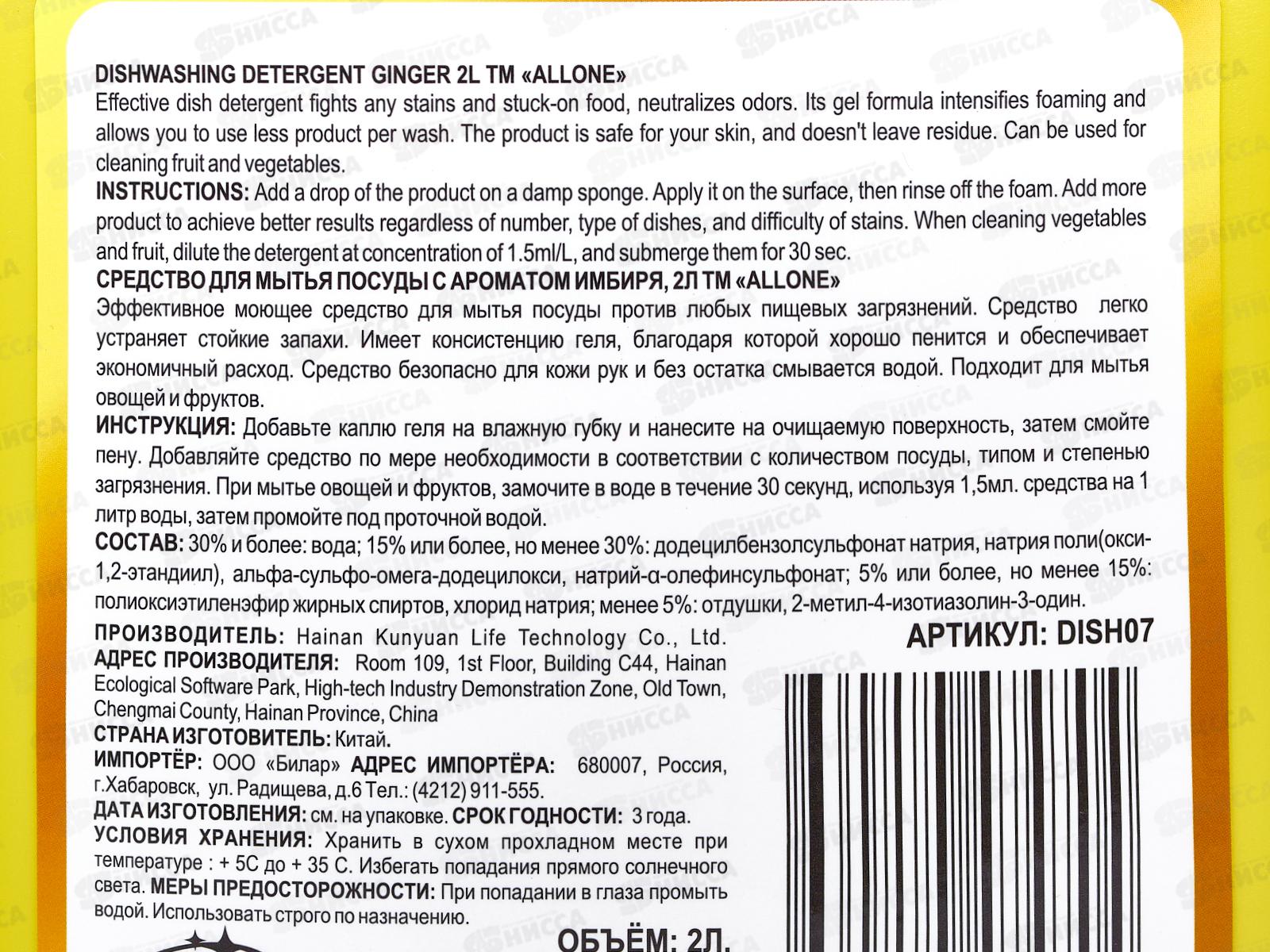 Состав: вода 30%, додецилбензолсульфонат натрия, натрия поли(окси-1,2-этандиил), альфа-cульфо-омега-додецилокси, натрий-а-олефинсульфонат, полиоксиэтиленэфир жирных спиртов, хлорид натрия, отдушка, 2-метил-4-изотиазолин-3.