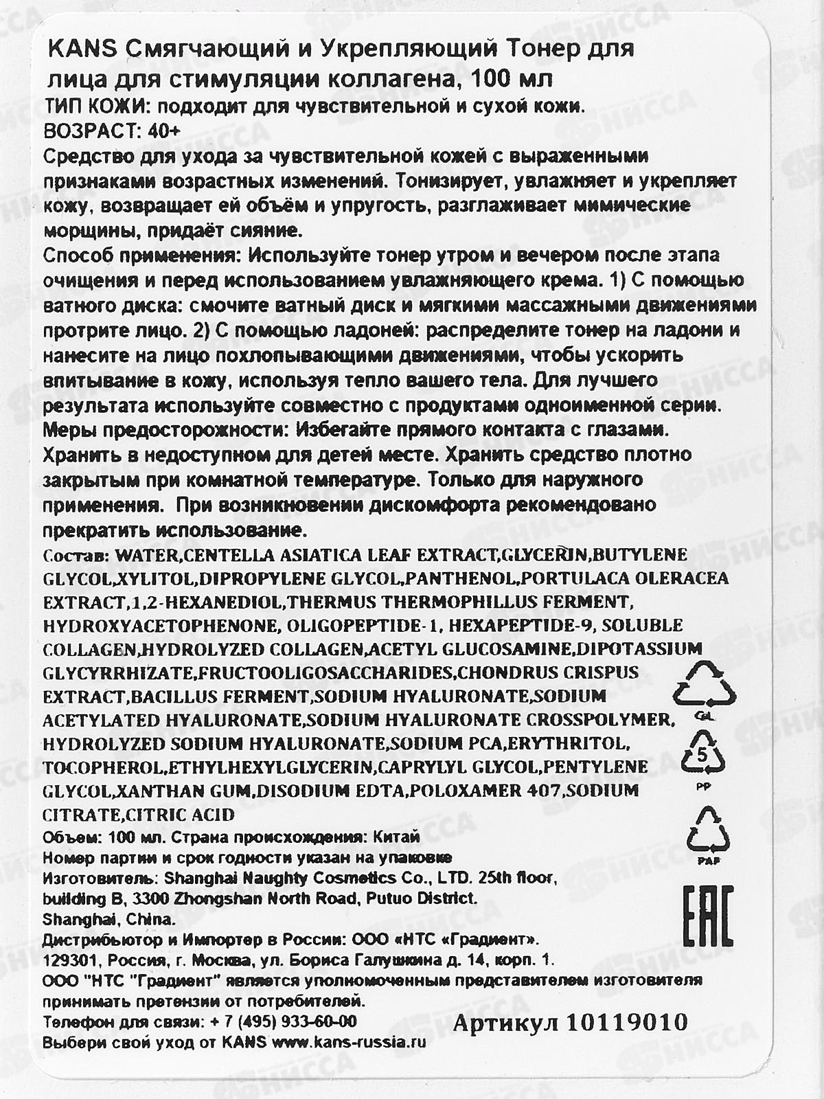 KANS Смягчающий и укрепляющий тонер для лица для стим коллагена 100мл