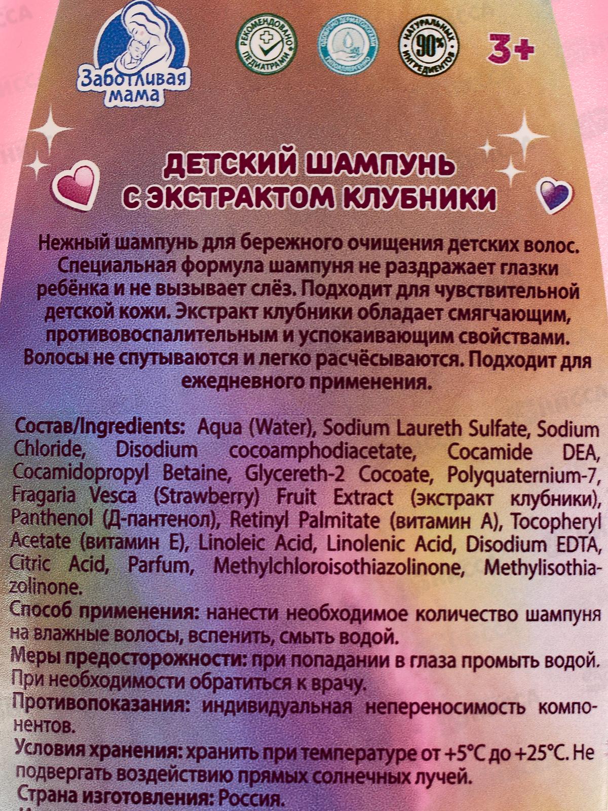 Состав: вода, лауретсульфат натрия, хлорид натрия, динатриевый кокоамфодиацетат, кокамид ДЭА, кокамидопропилбетаин, глицерет?2 кокоат, поликватерниум?7, экстракт плодов земляники лесной (Fragaria vesca, экстракт клубники), пантенол (Д?пантенол), ретинилпальмитат (витамин А), ацетат токоферила (витамин Е), линолевая кислота, линоленовая кислота, динатриевая соль ЭДТА, лимонная кислота, отдушка, метилхлоризотиазолинон, метилизотиазолинон.