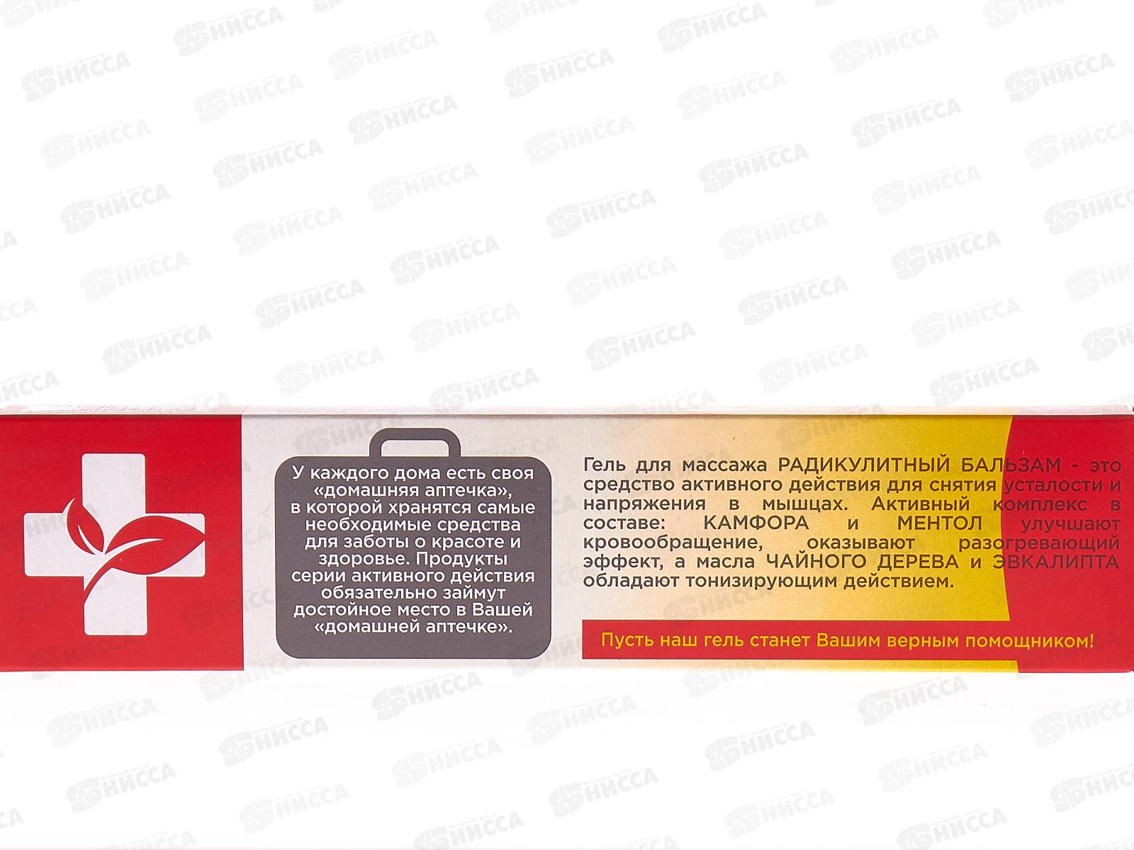 Гель для массажа «РАДИКУЛИТНЫЙ БАЛЬЗАМ» - средство для уменьшения усталости и напряжения (в сочетании с массажем). Активные компоненты: масла чайного дерева и эвкалипта улучшают кровообращение, обладают восстанавливающим действием; камфора оказывает разогревающий эффект; ментол освежает и тонизирует. Сочетание массажа с применением геля для массажа «РАДИКУЛИТНЫЙ БАЛЬЗАМ» поможет быстро снять напряжение, усталость и боль. Радикулитный бальзам - обладает разогревающим действием, улучшает микроциркуляцию в коже. Гель-бальзам плотной кремовой текстуры для всех типов кожи.