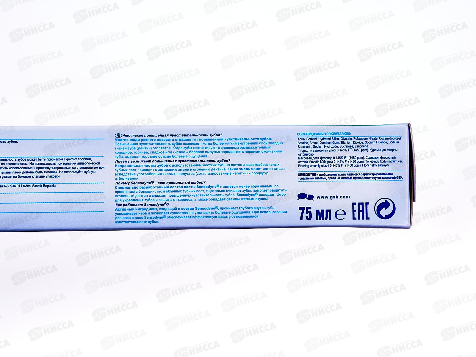 Зубная паста Sensodyne Защита от кариеса с фтором способствует уменьшению болезненные ощущения, вызванные чувствительностью зубов. Массовая доля фторида 0,145 % F? (1450 ppm). Содержит фтористый натрий. Состав: Вода, Сорбит, Гидратированный диоксид кремния, Глицерин, Нитрат калия, Ароматизатор, Ксантановая камедь, Кокамидопропилбетаин, Метилкокоилтаурат натрия, Сахарин натрия, фторид натрия, гидроксид натрия, Лимонен, CI 42090, CI 19140.