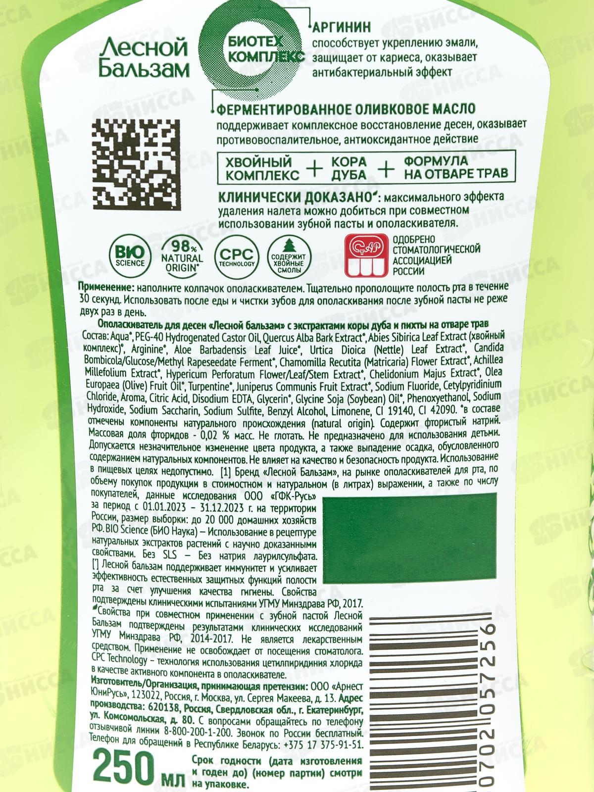 Концерн Калина ЛЕСНОЙ БАЛЬЗАМ ополаскиватель для полости рта 250мл кора дуба/пихта *6/12