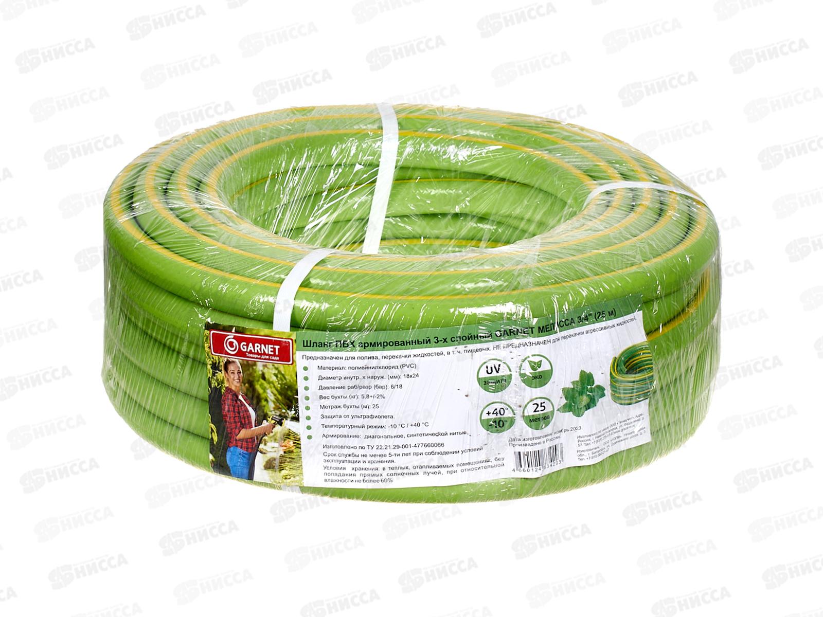 Код:567914; Шланг полив ПВХ армир. 3-x сл. 3/4 GARNET Мелисса зелен с желт. 25м