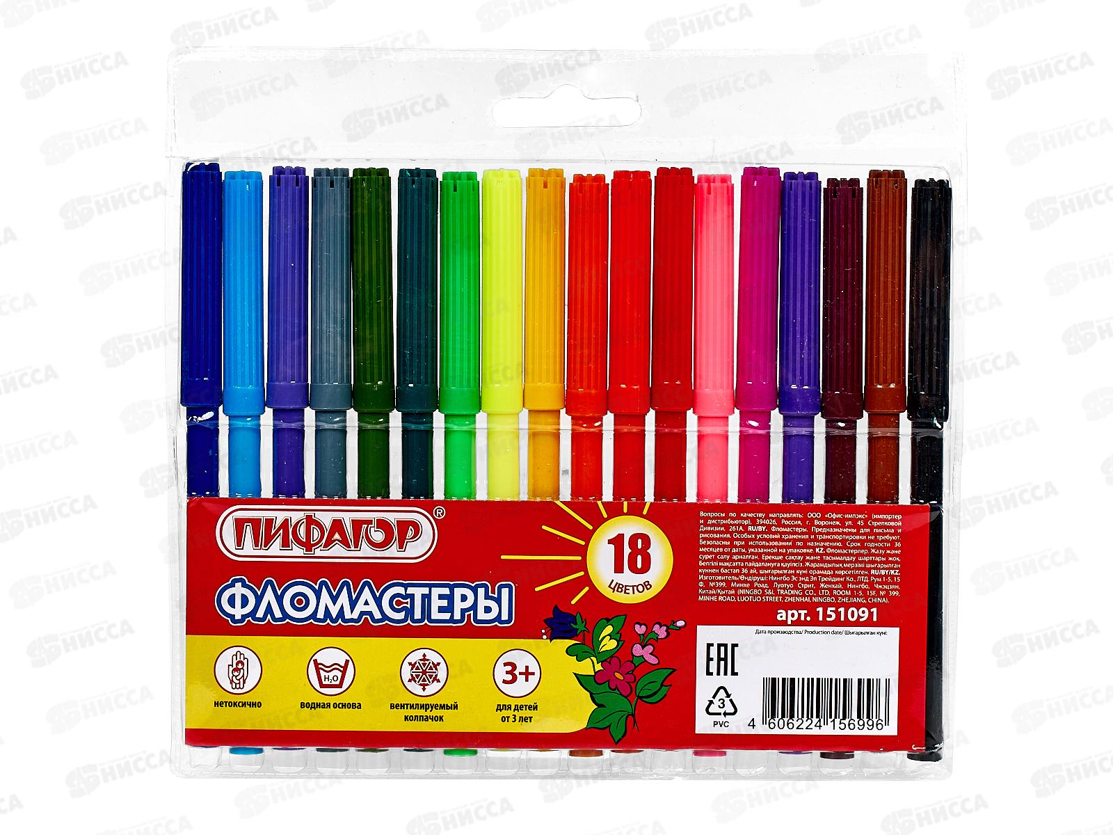 Код:498932; Фломастеры 18 цветов ПИФАГОР 151091*12/96