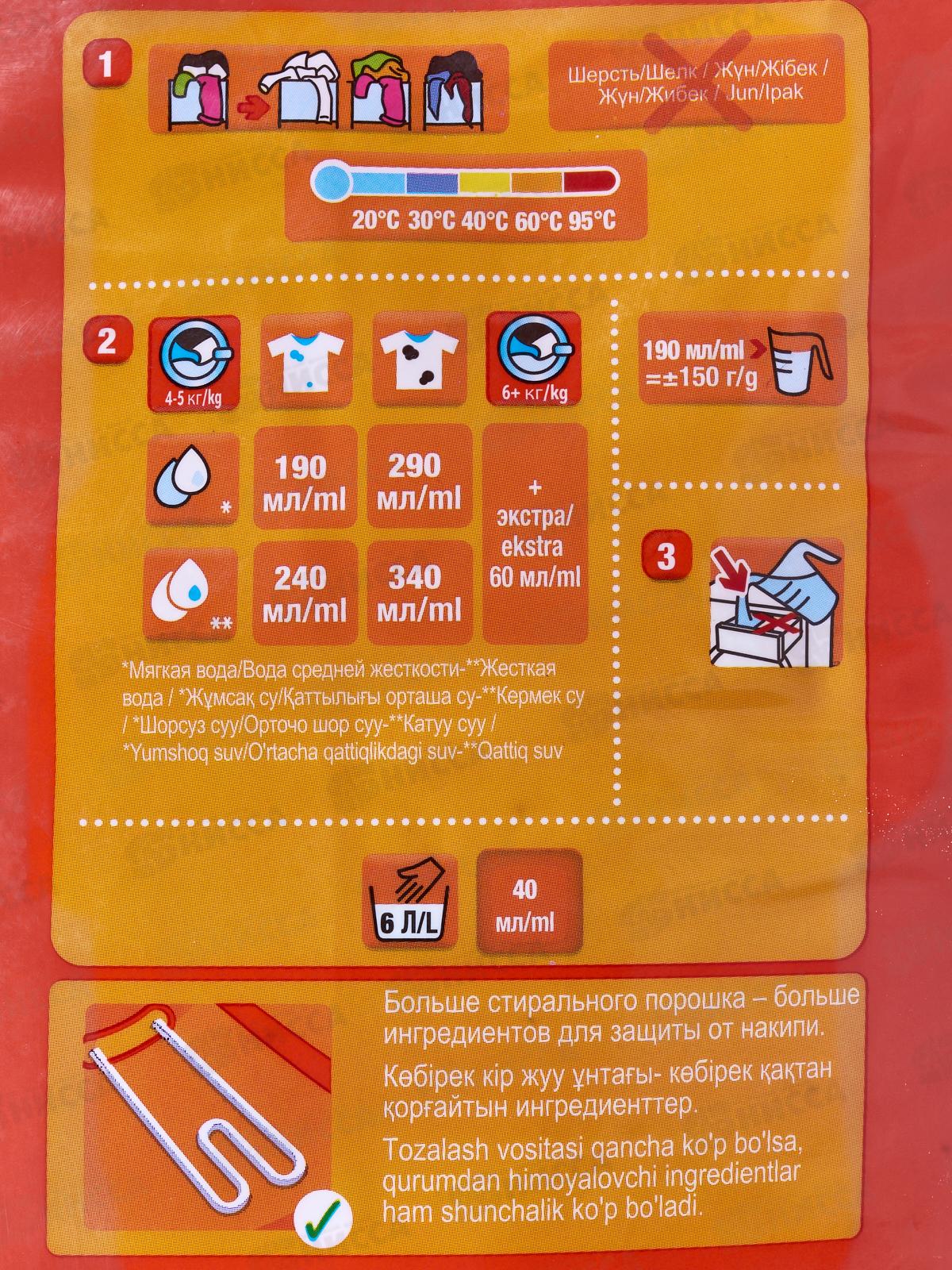 Состав: 5–15?% анионных поверхностно?активных веществ, менее 5?% неионных поверхностно?активных веществ, отбеливающие агенты на кислородной основе, фосфонаты, поликарбоксилаты, цеолиты, энзимы (ферменты), оптические отбеливатели, отдушки.