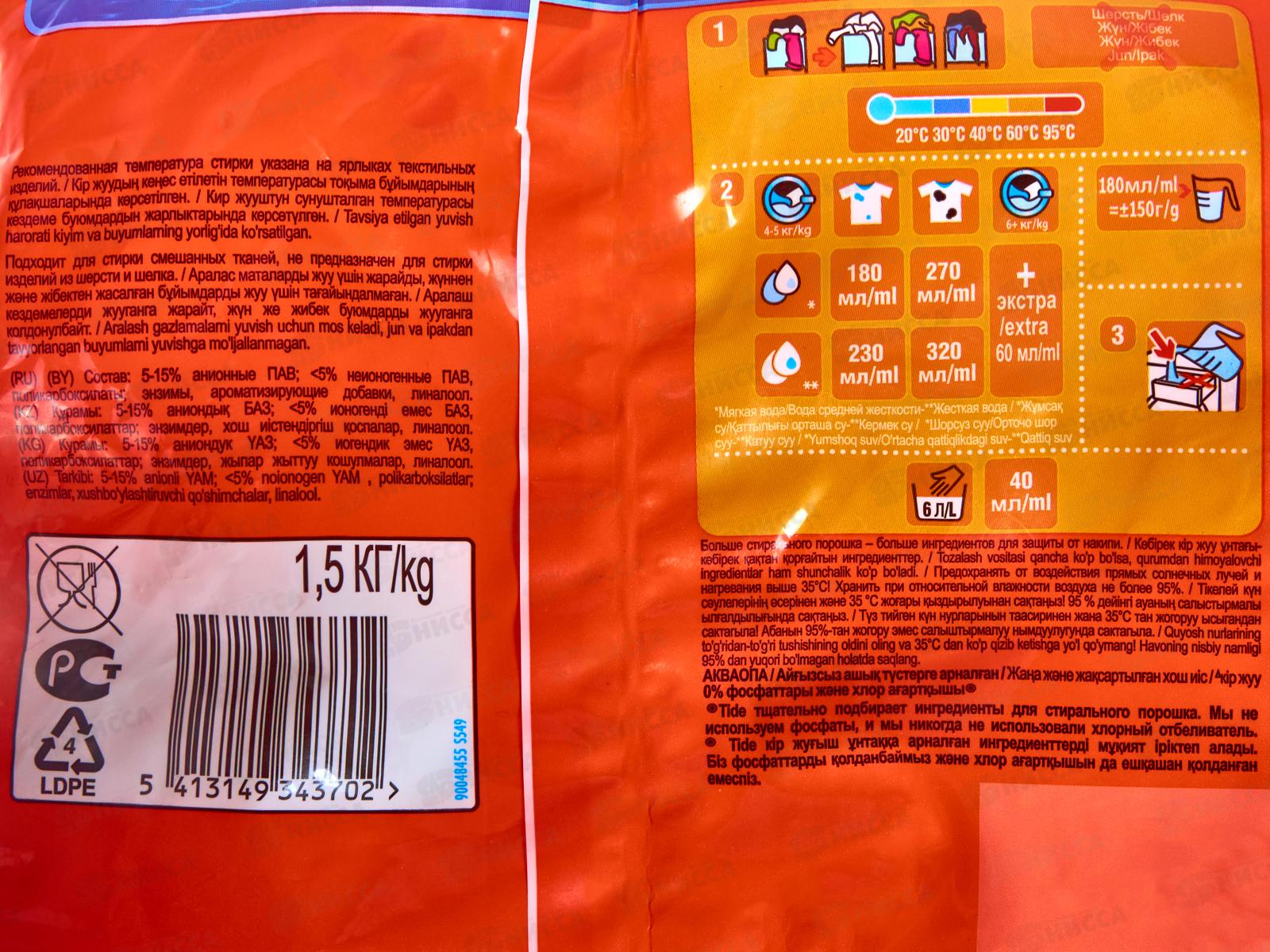 Состав: 5–15% анионные ПАВ, менее 5% неионогенные ПАВ, поликарбоксилаты, энзимы, ароматизирующие добавки, линалоол.