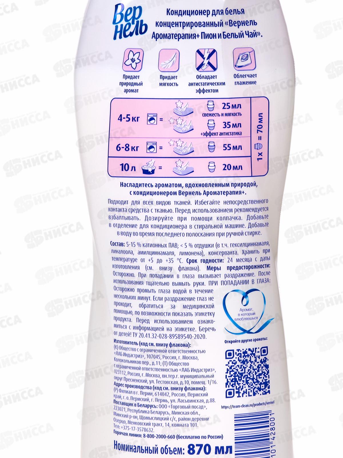 ВЕРНЕЛЬ Арома Пион и Белый чай кондиционер для белья 870мл *12