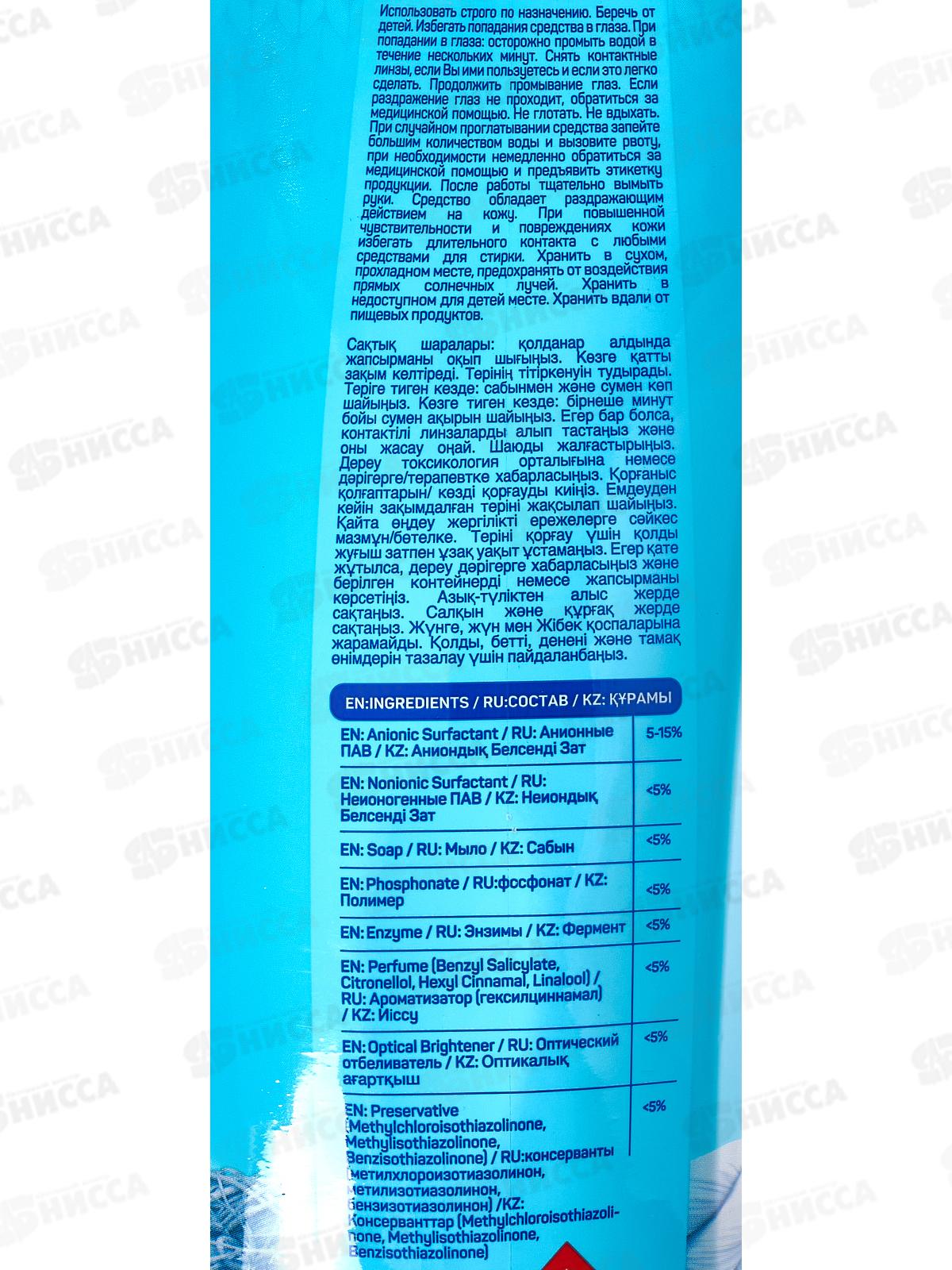 Состав: вода 30%, анионные ПАВ 5-15%, неиногенные ПАВ 5%, мыло 5%, фосфонаты 5%, энзимы 5%, оптические отбеливатели 5%, парфюмерная композиция 5%, консервант 5%.